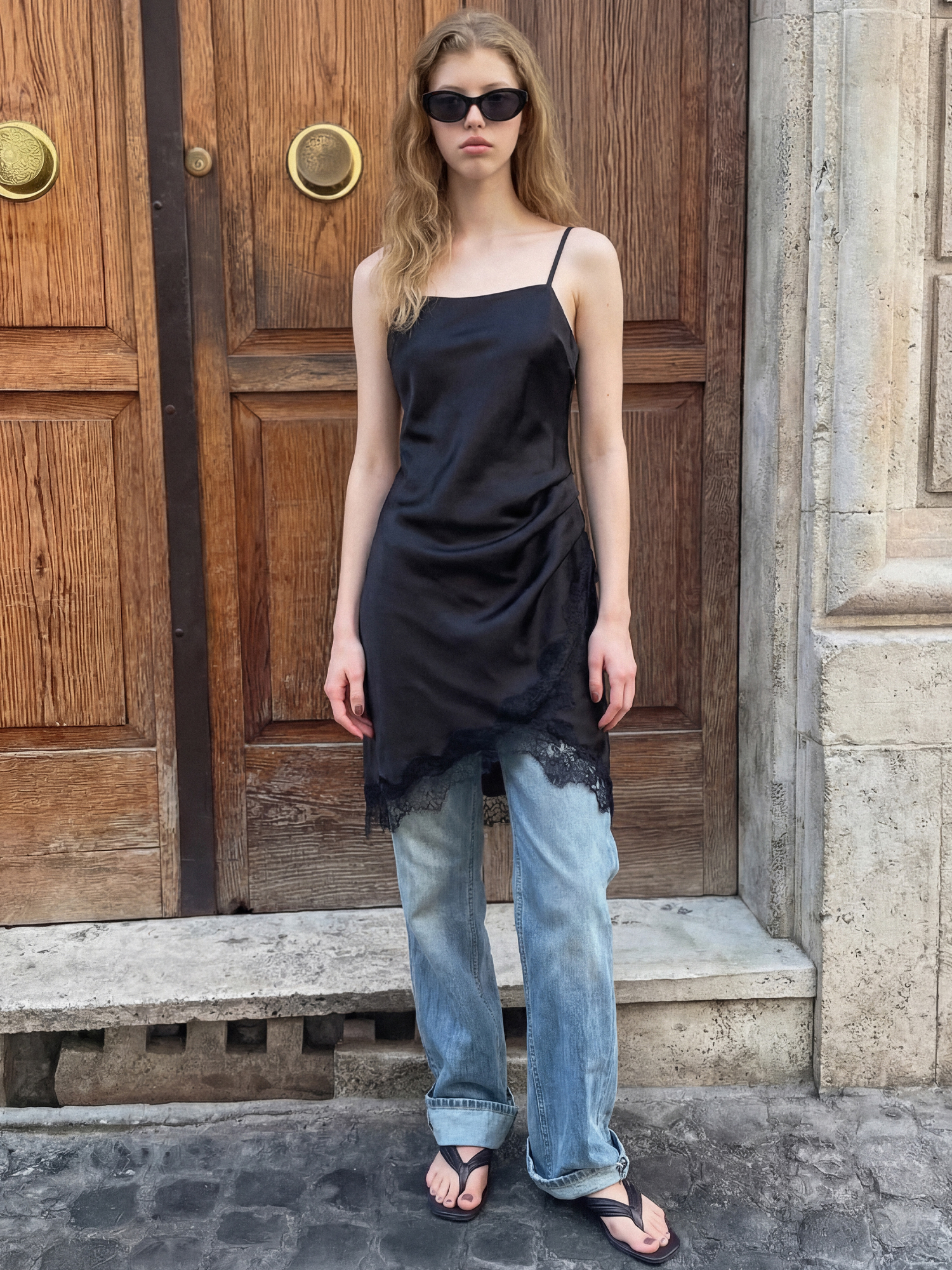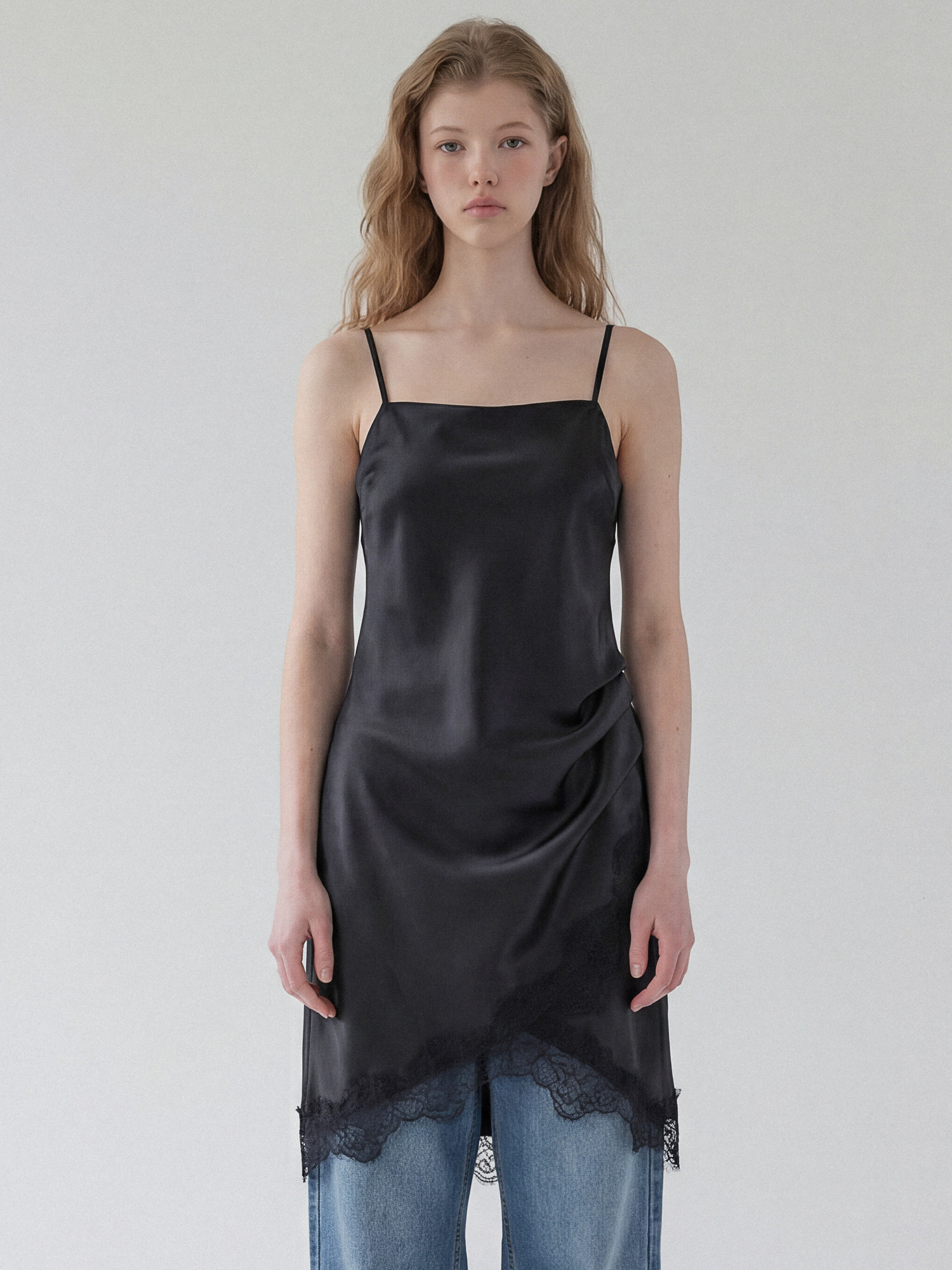 부드러운 광택감의 새틴소재에 레이스 트리밍이 여성스럽고 트렌드한 무드의 슬립 드레스입니다.