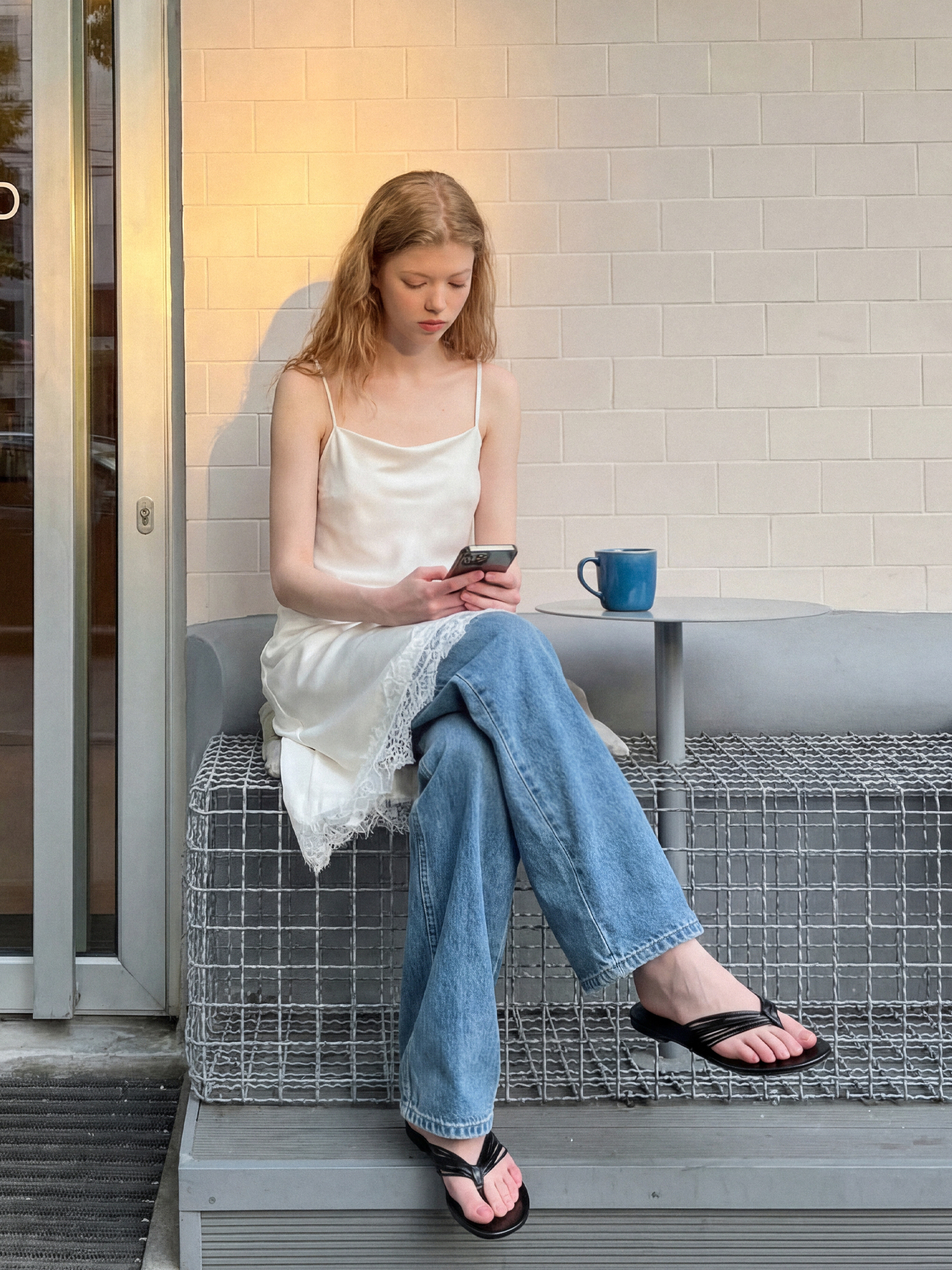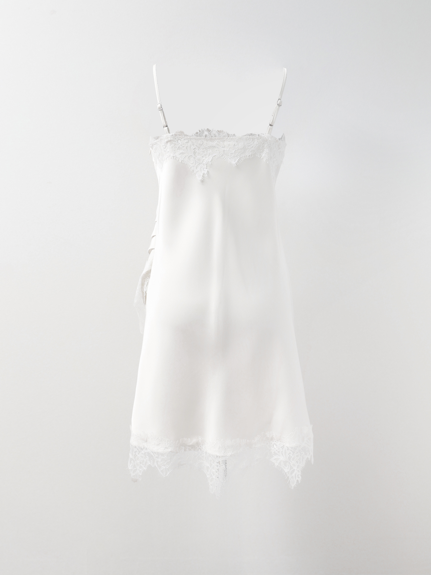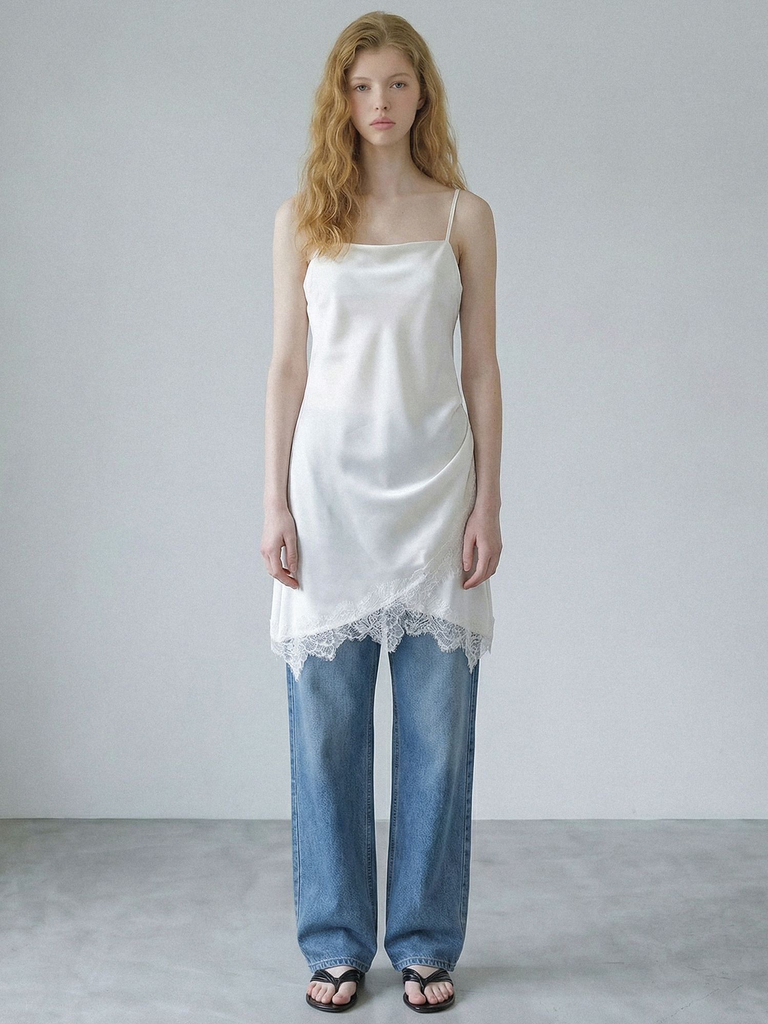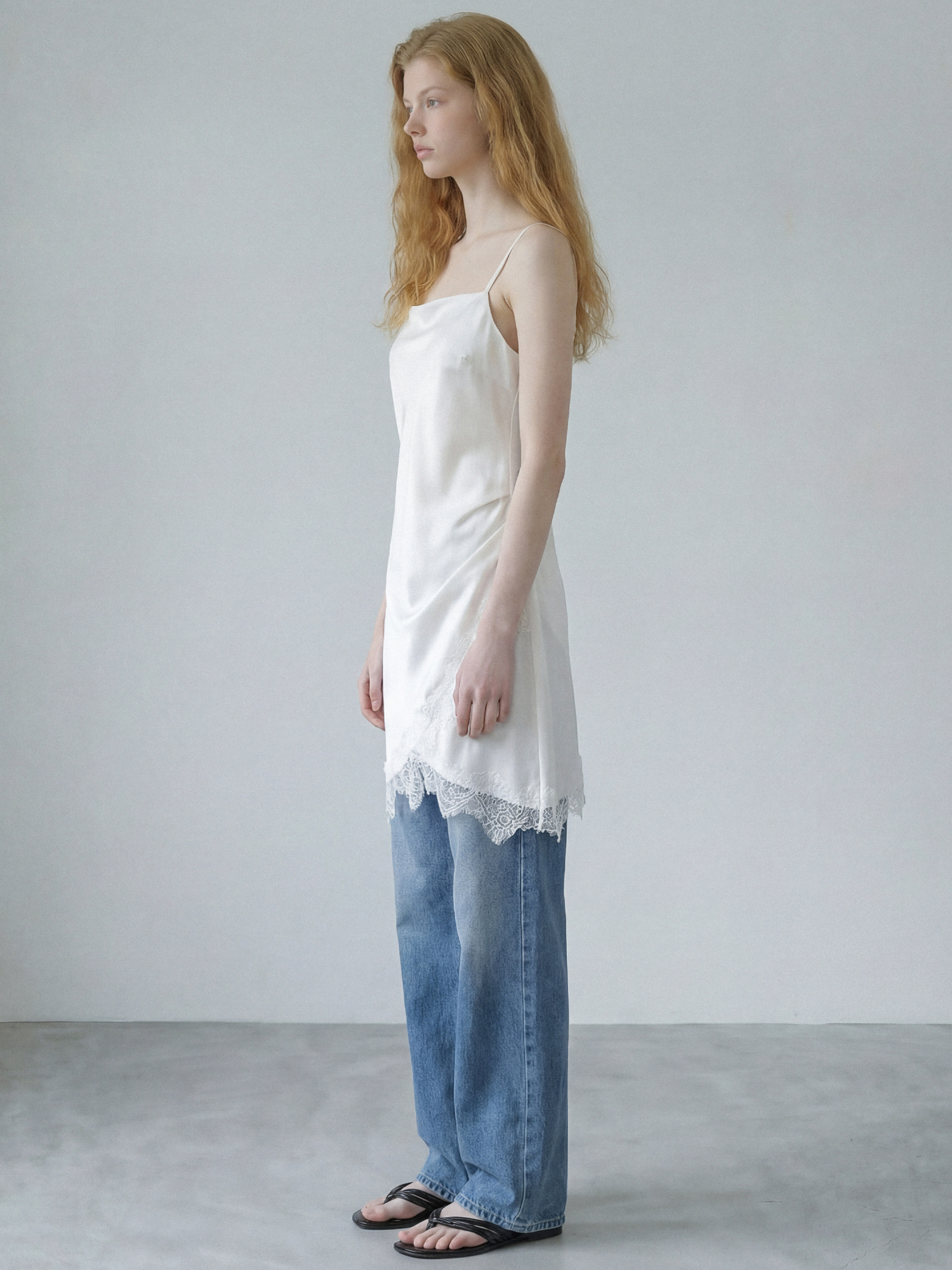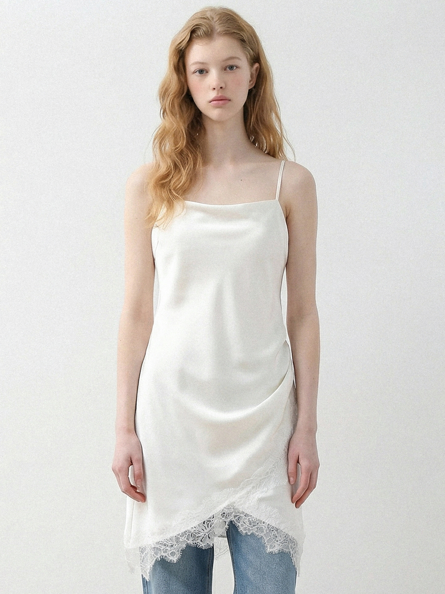 부드러운 광택감의 새틴소재에 레이스 트리밍이 여성스럽고 트렌드한 무드의 슬립 드레스입니다.