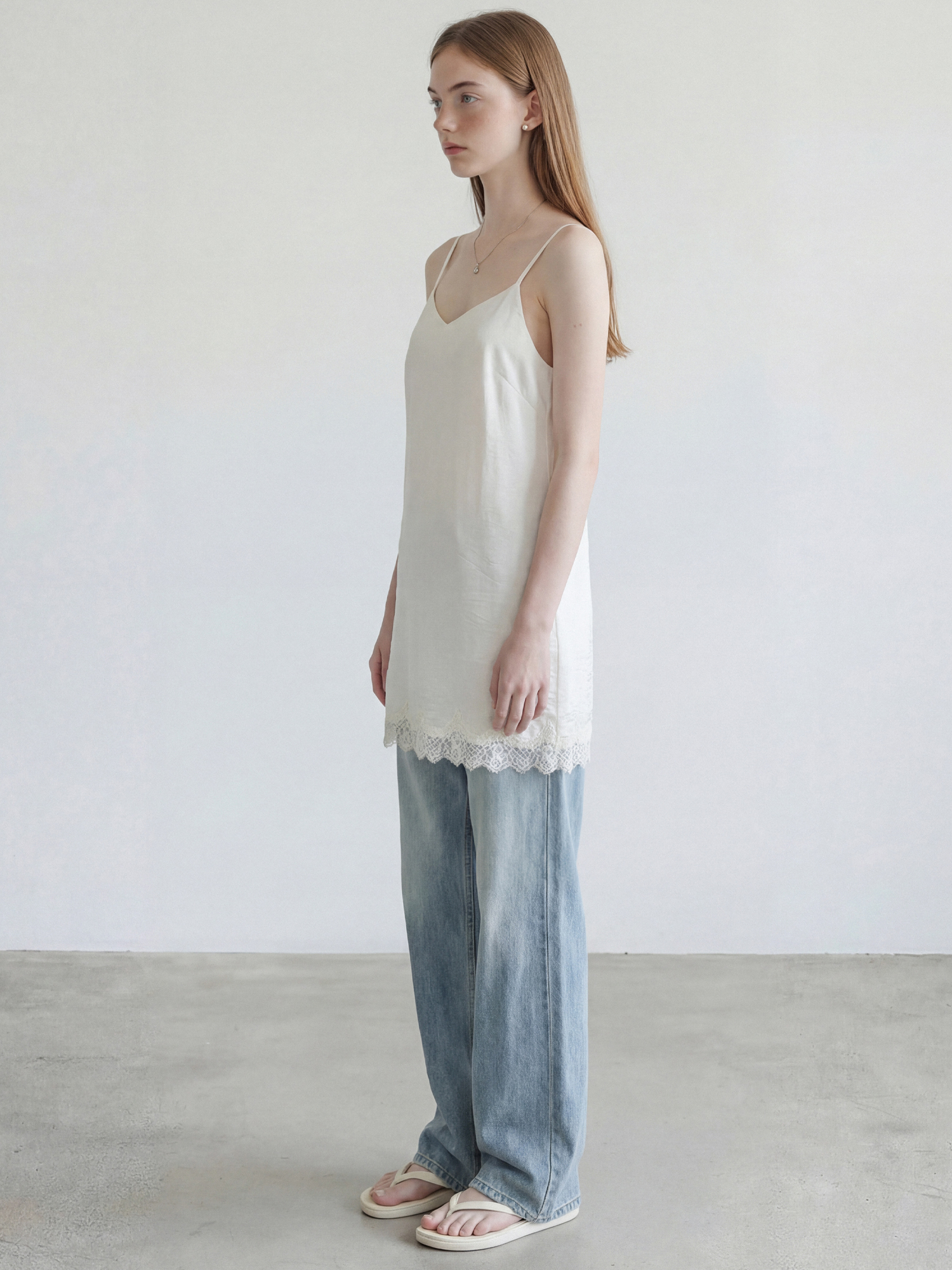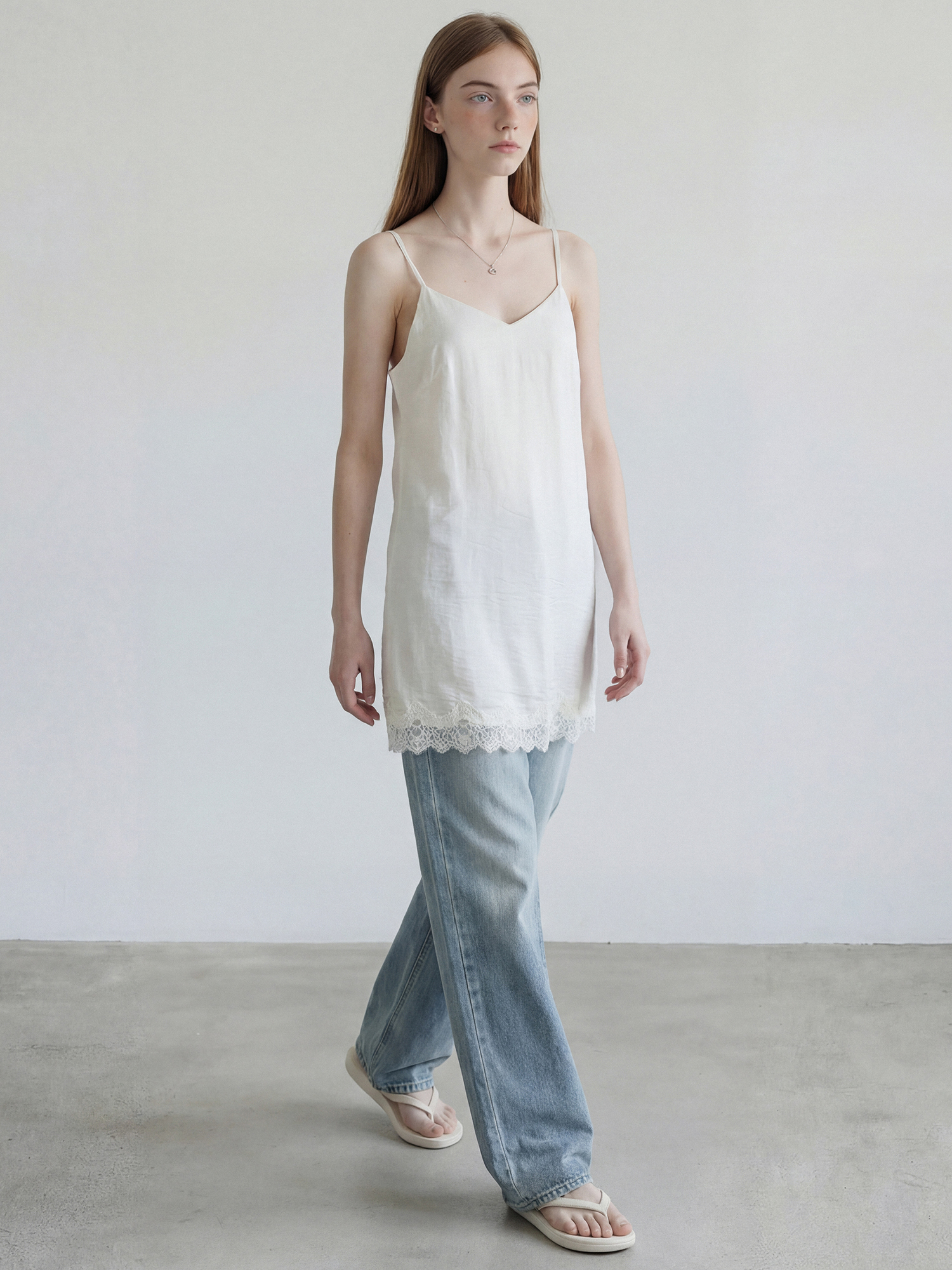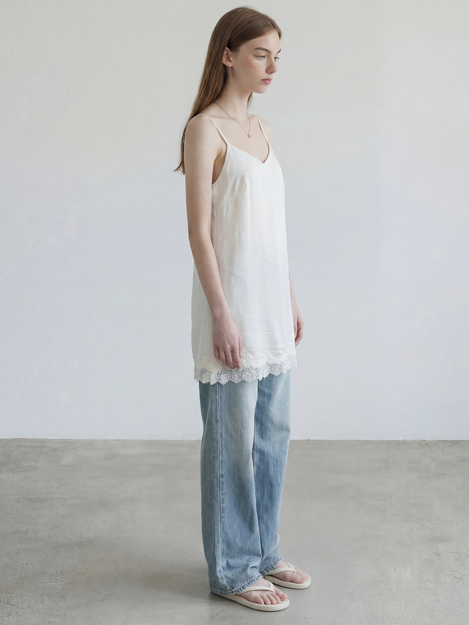 밑단 레이스 트리밍으로 은은한 포인트를 더한 슬립 드레스입니다.