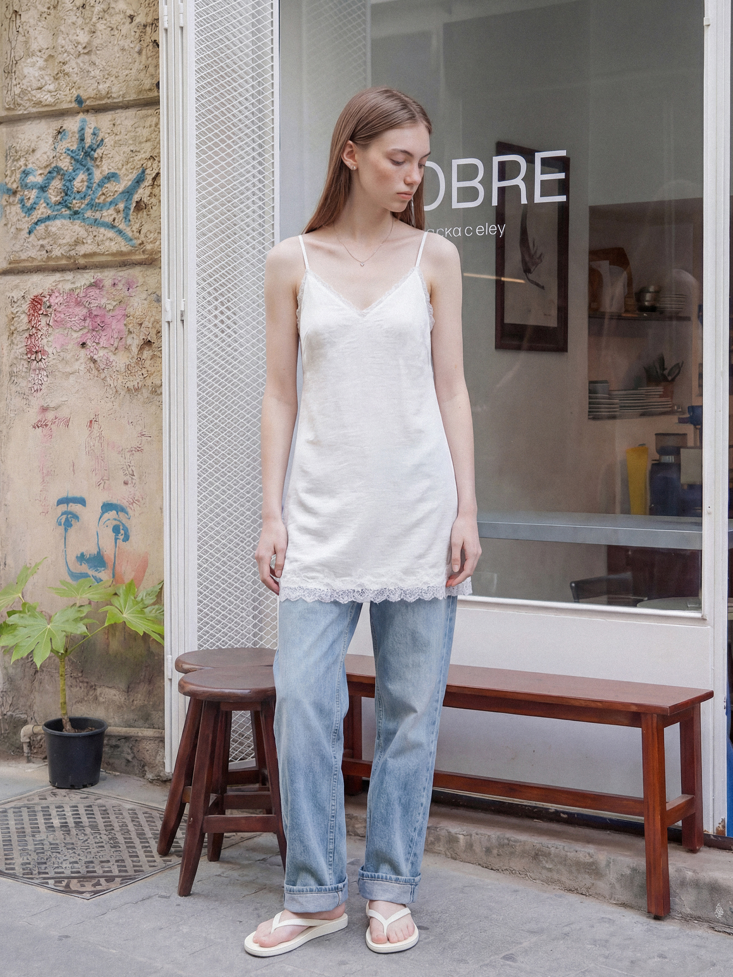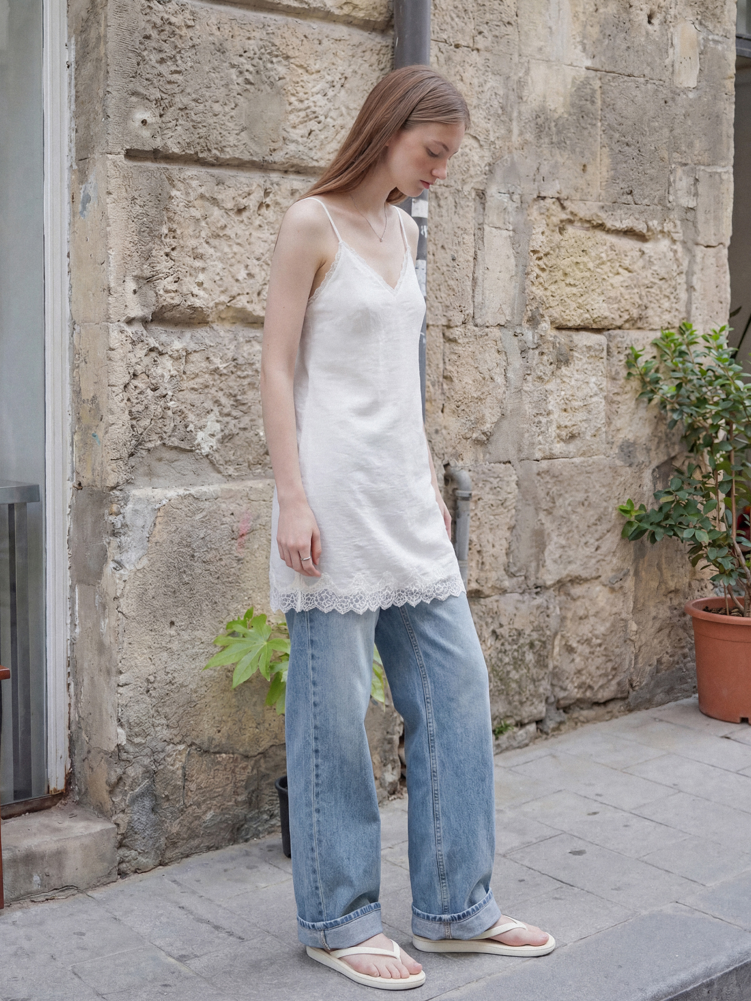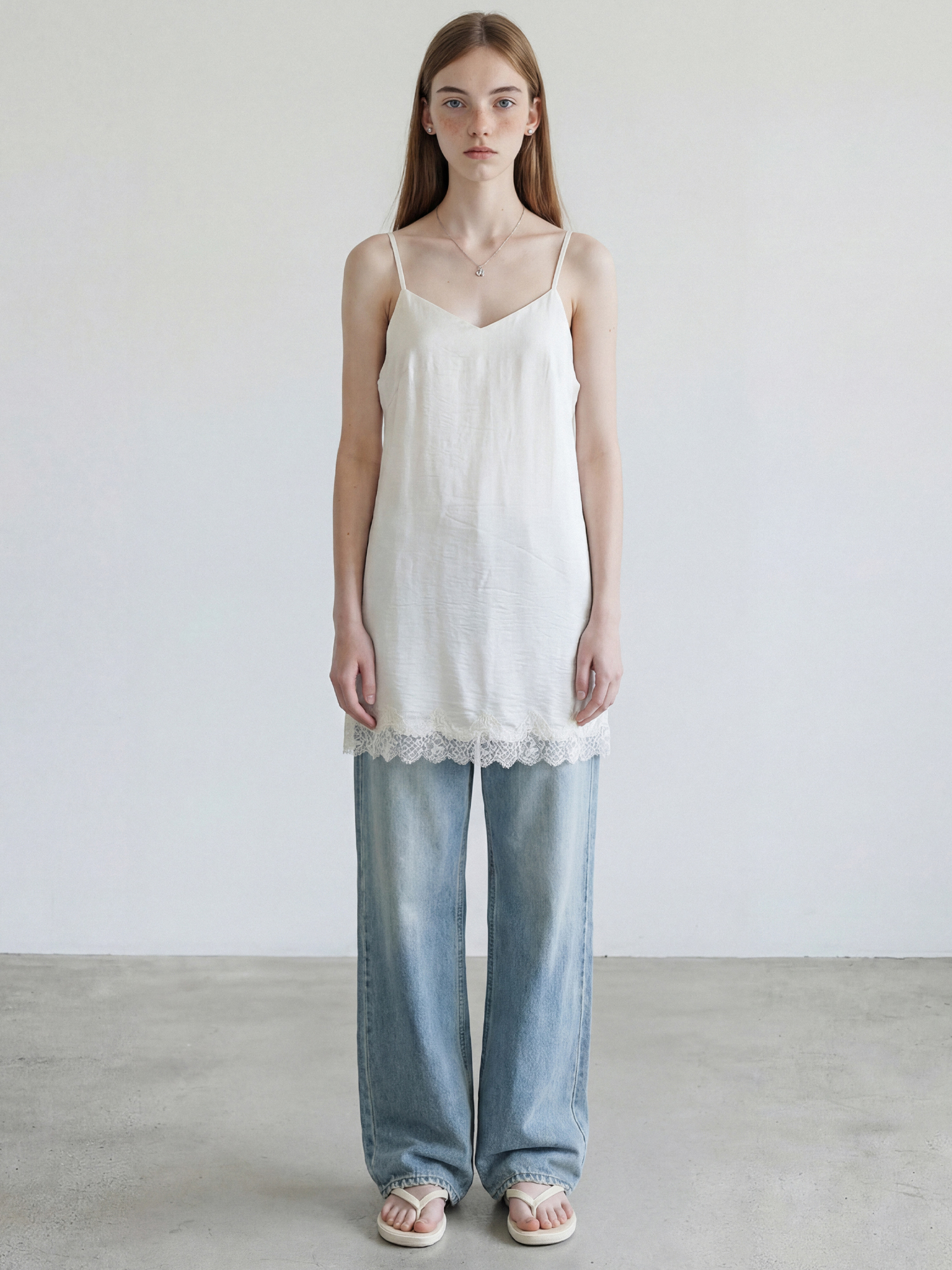 밑단 레이스 트리밍으로 은은한 포인트를 더한 슬립 드레스입니다.