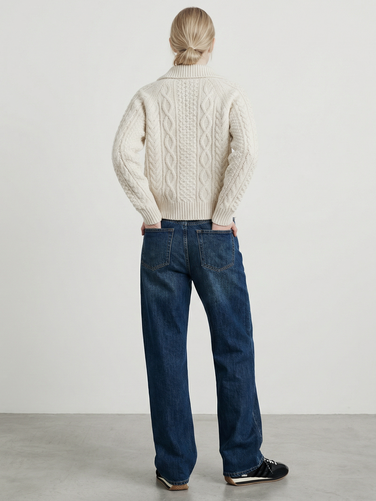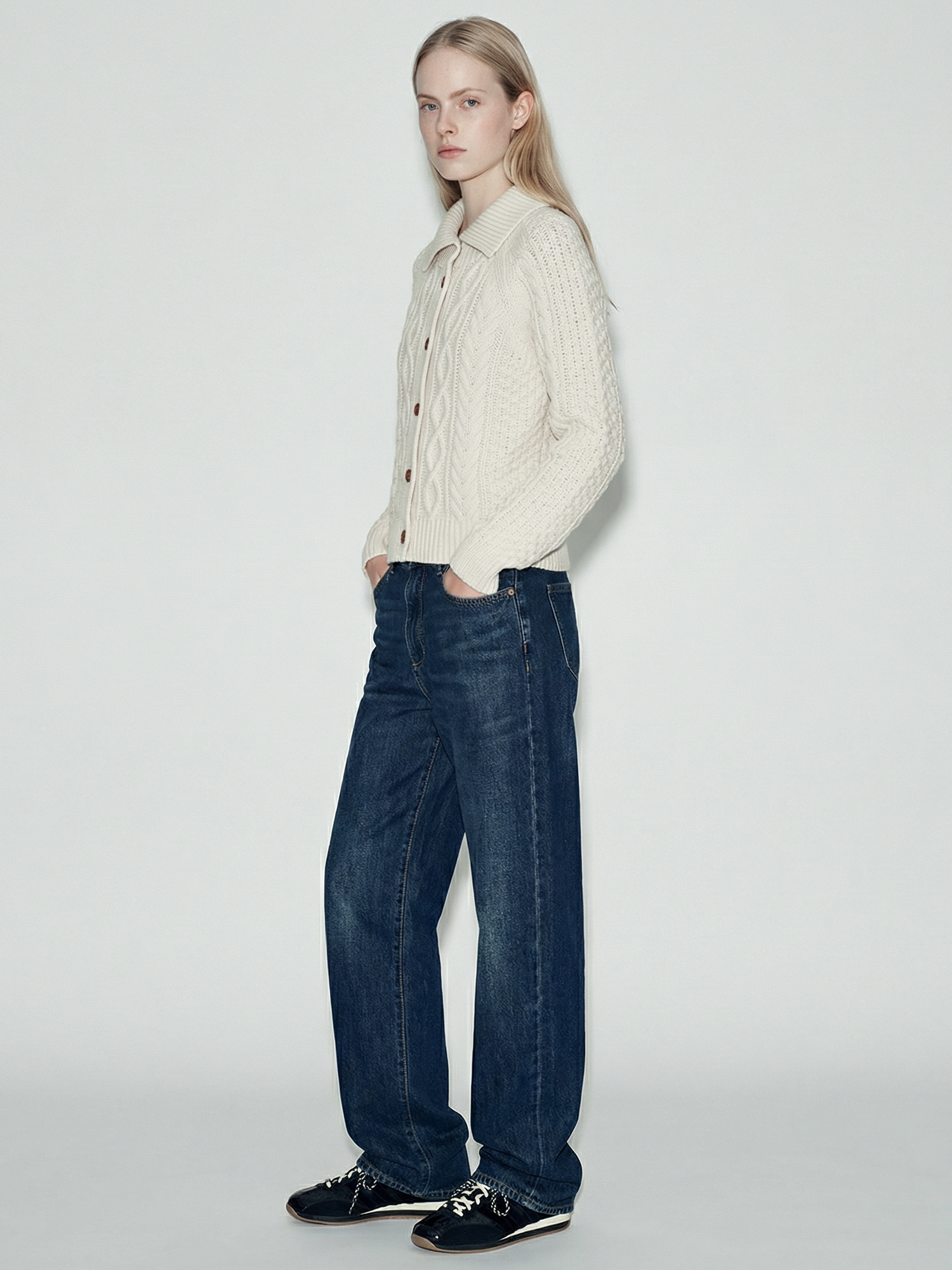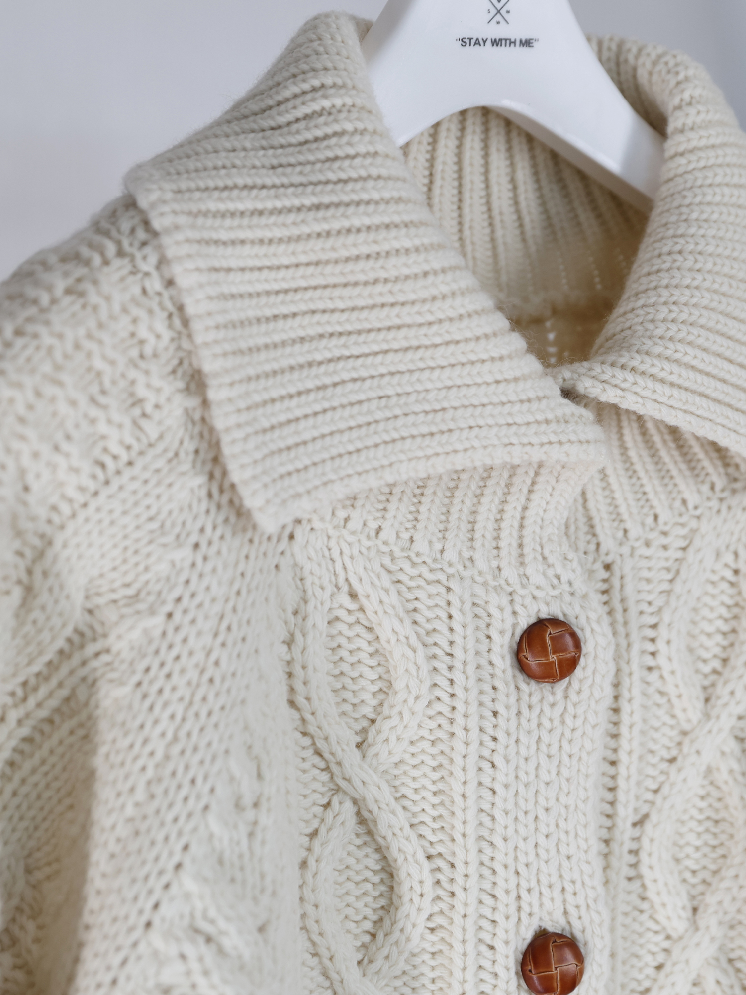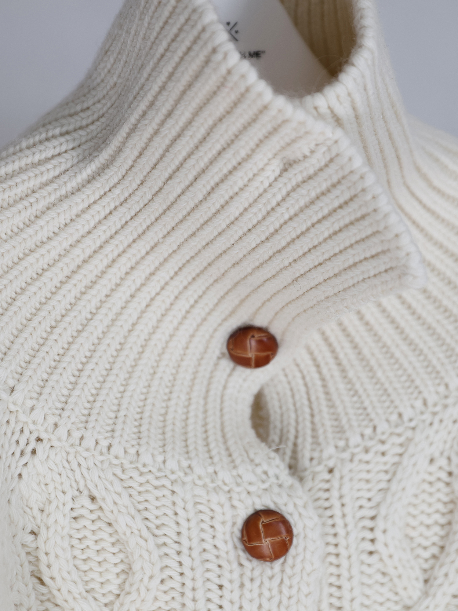 청기한 무드의 케이블 패턴과 하이넥으로 여밀 수 있는 와이드 카라
