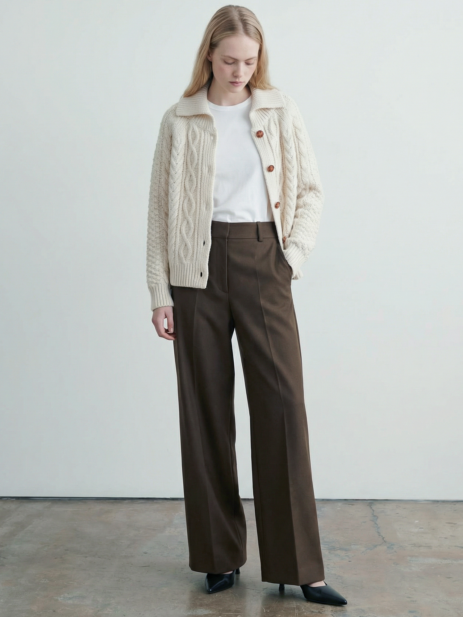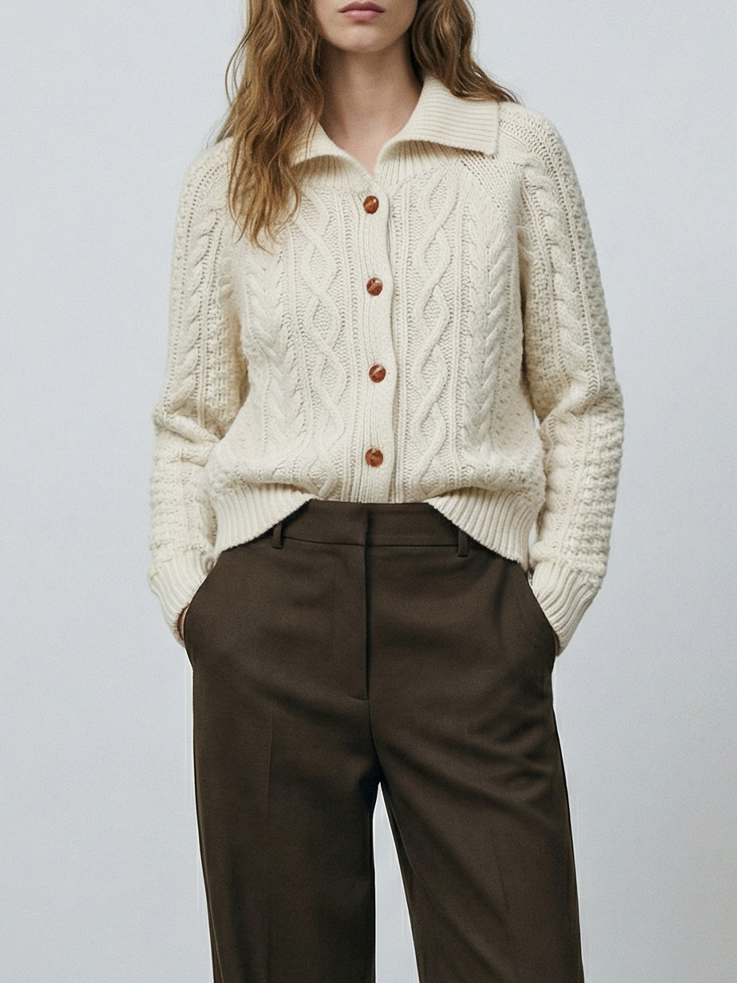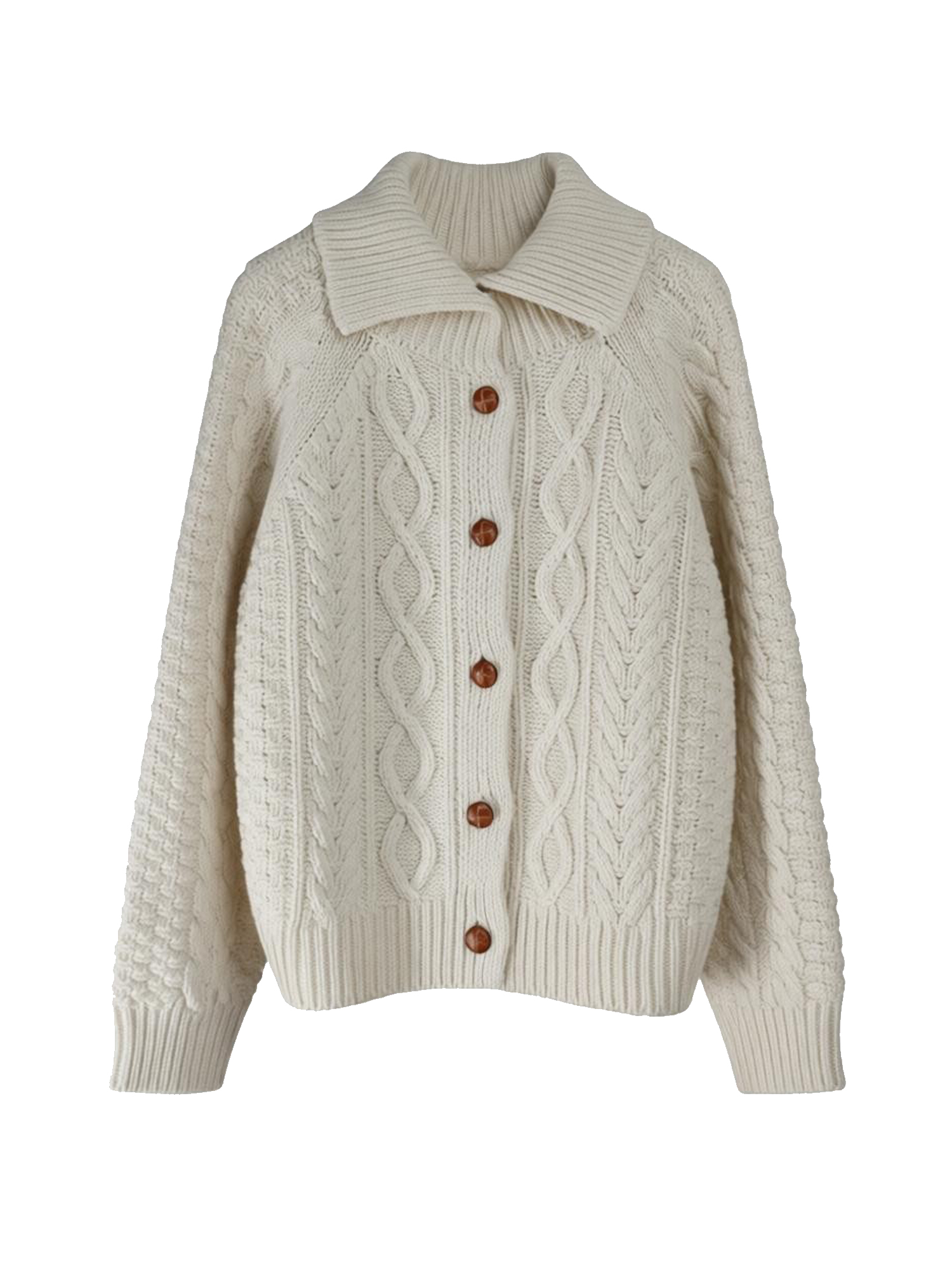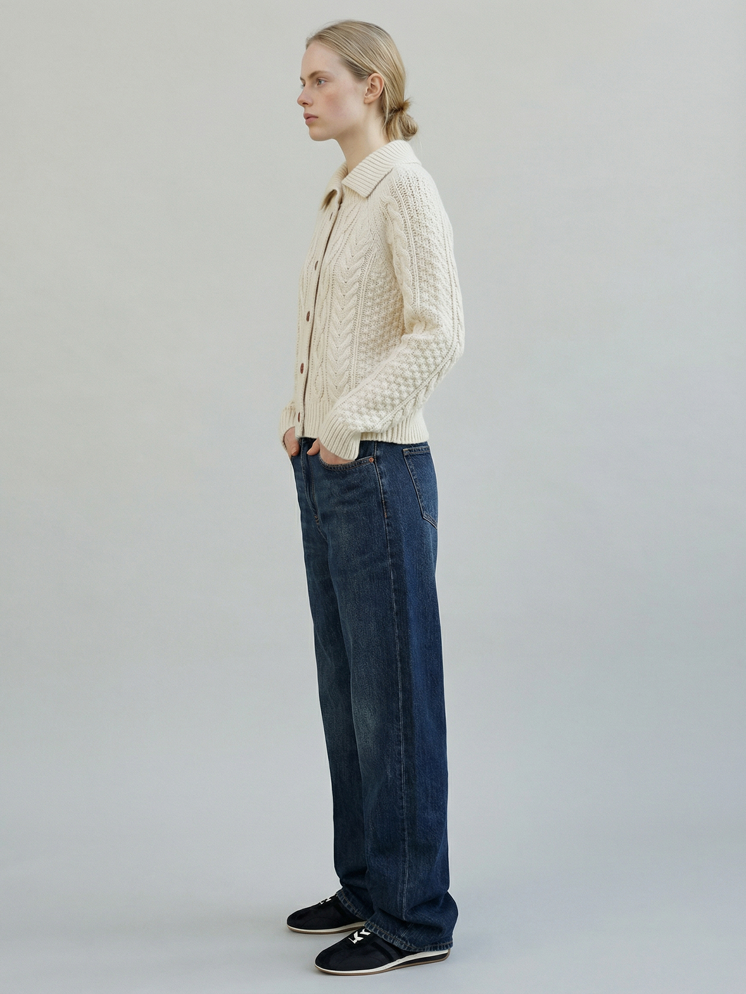청기한 무드의 케이블 패턴과 하이넥으로 여밀 수 있는 와이드 카라