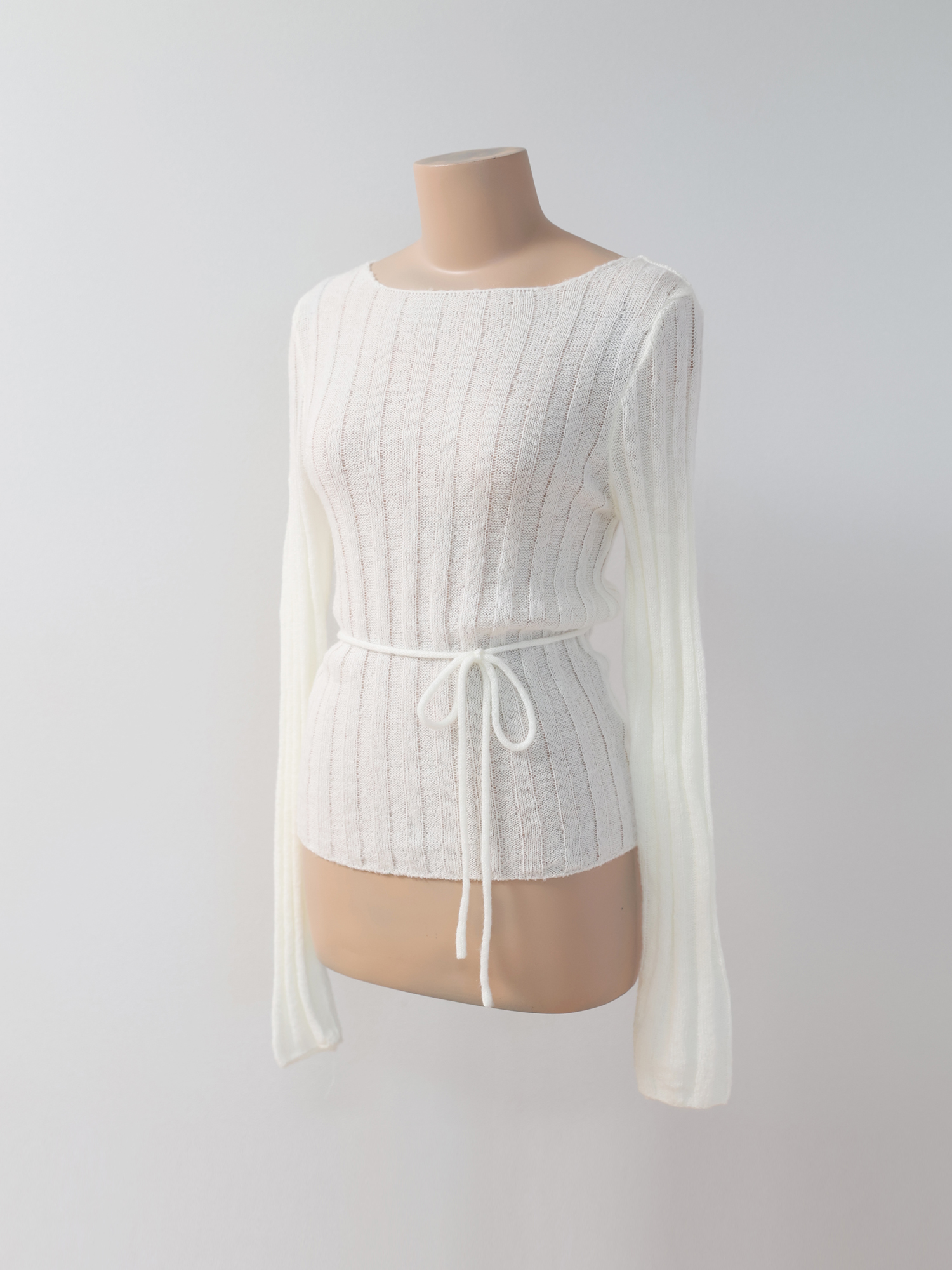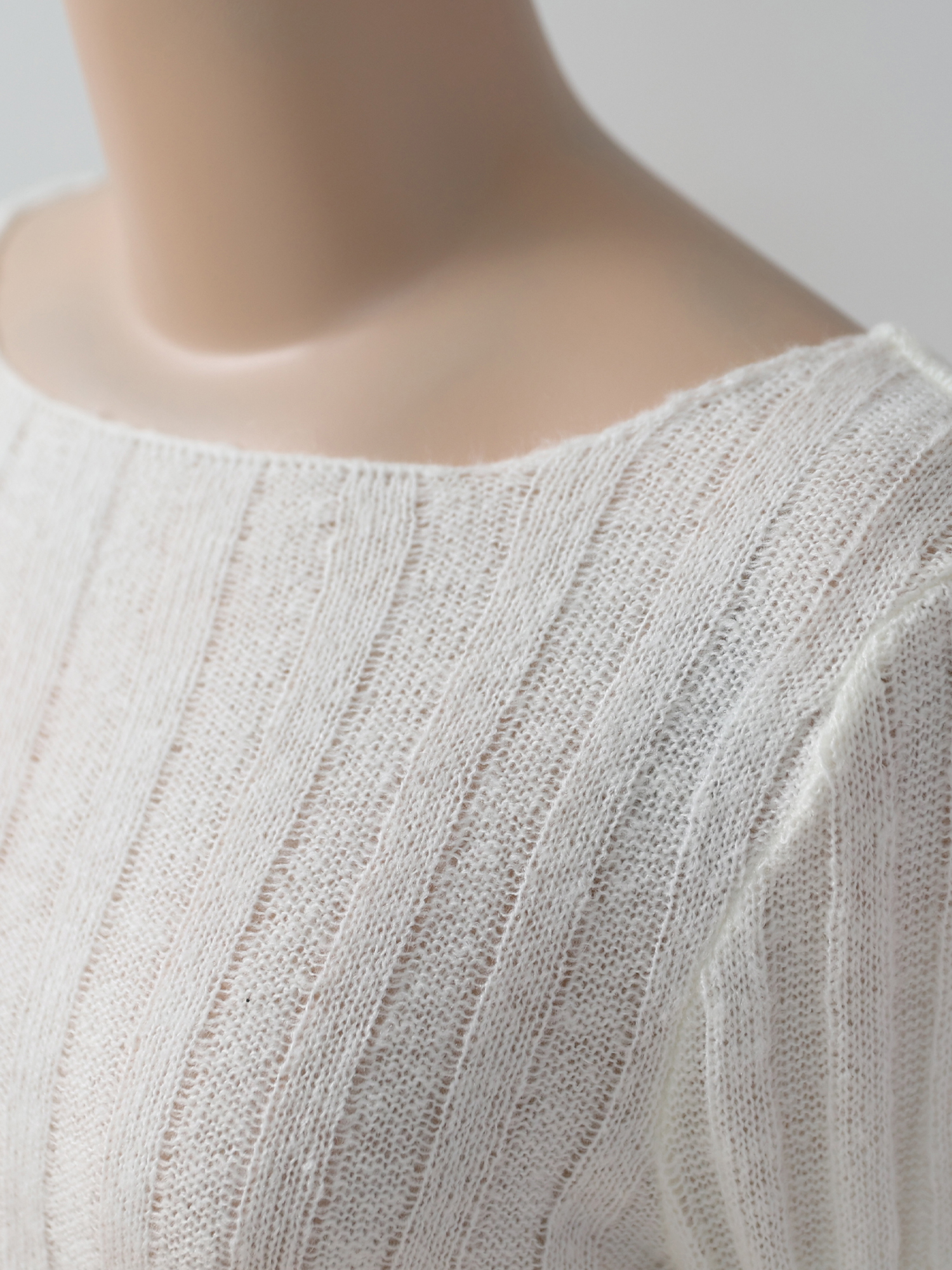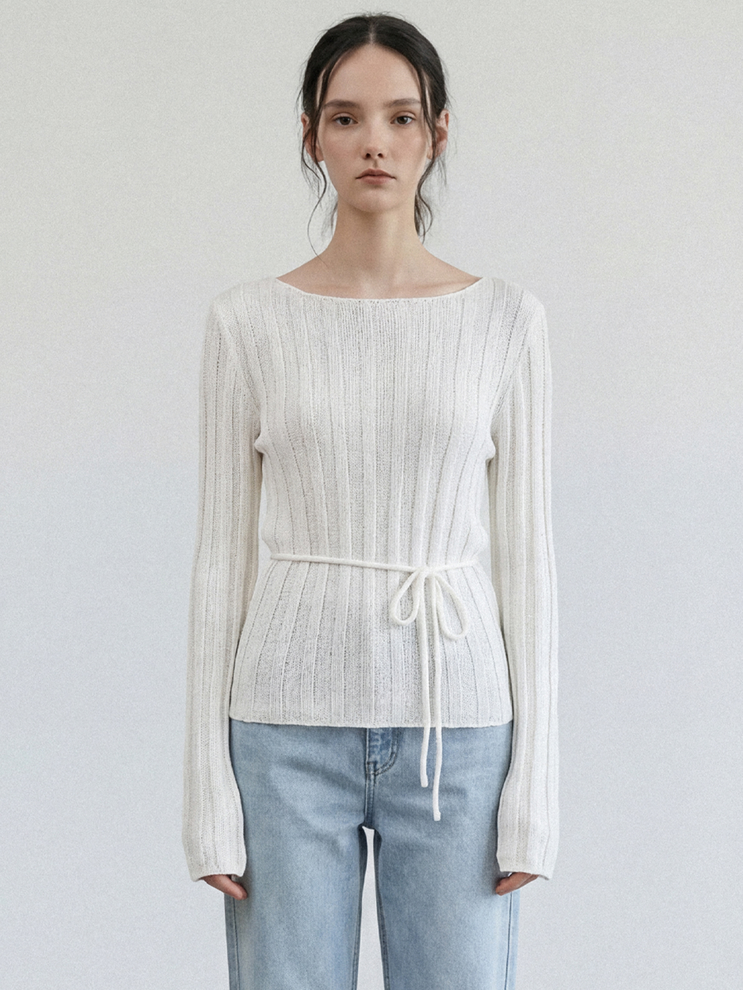 보트넥에 버티컬 립 패턴, 손등을 덮는 길이의 소매는 체형을 조금 더 슬림해 보이게 합니다.