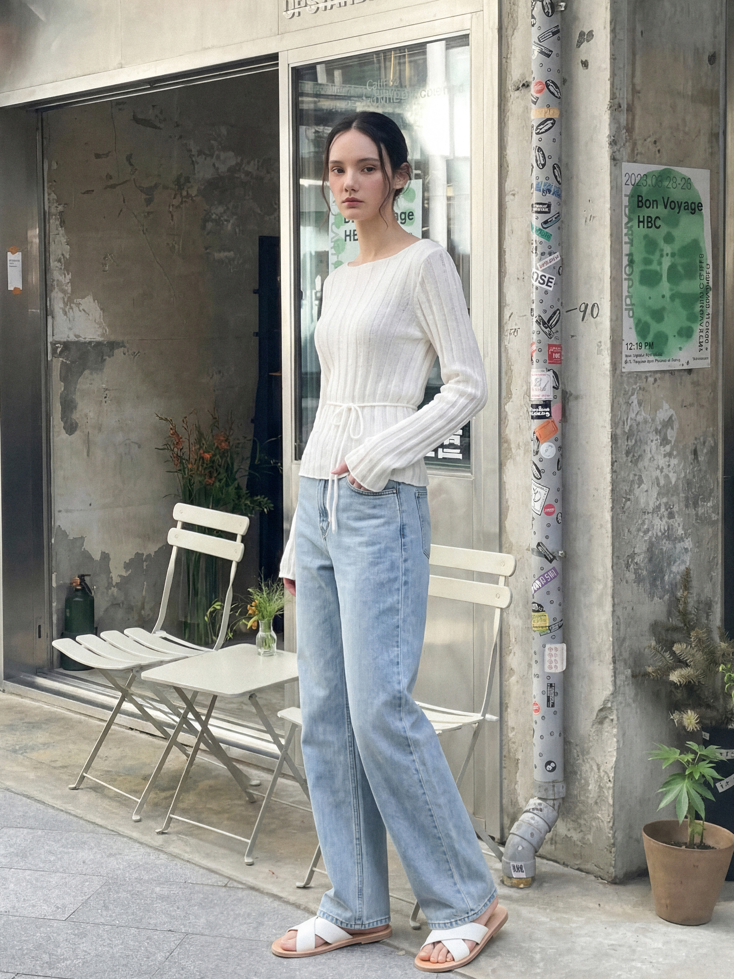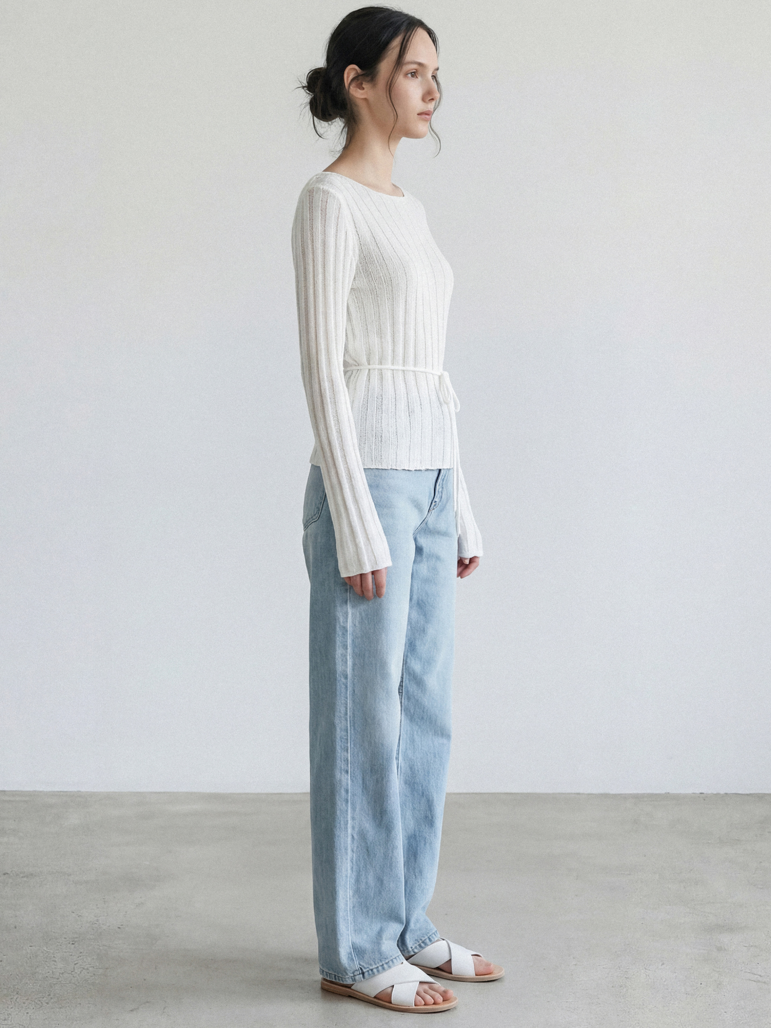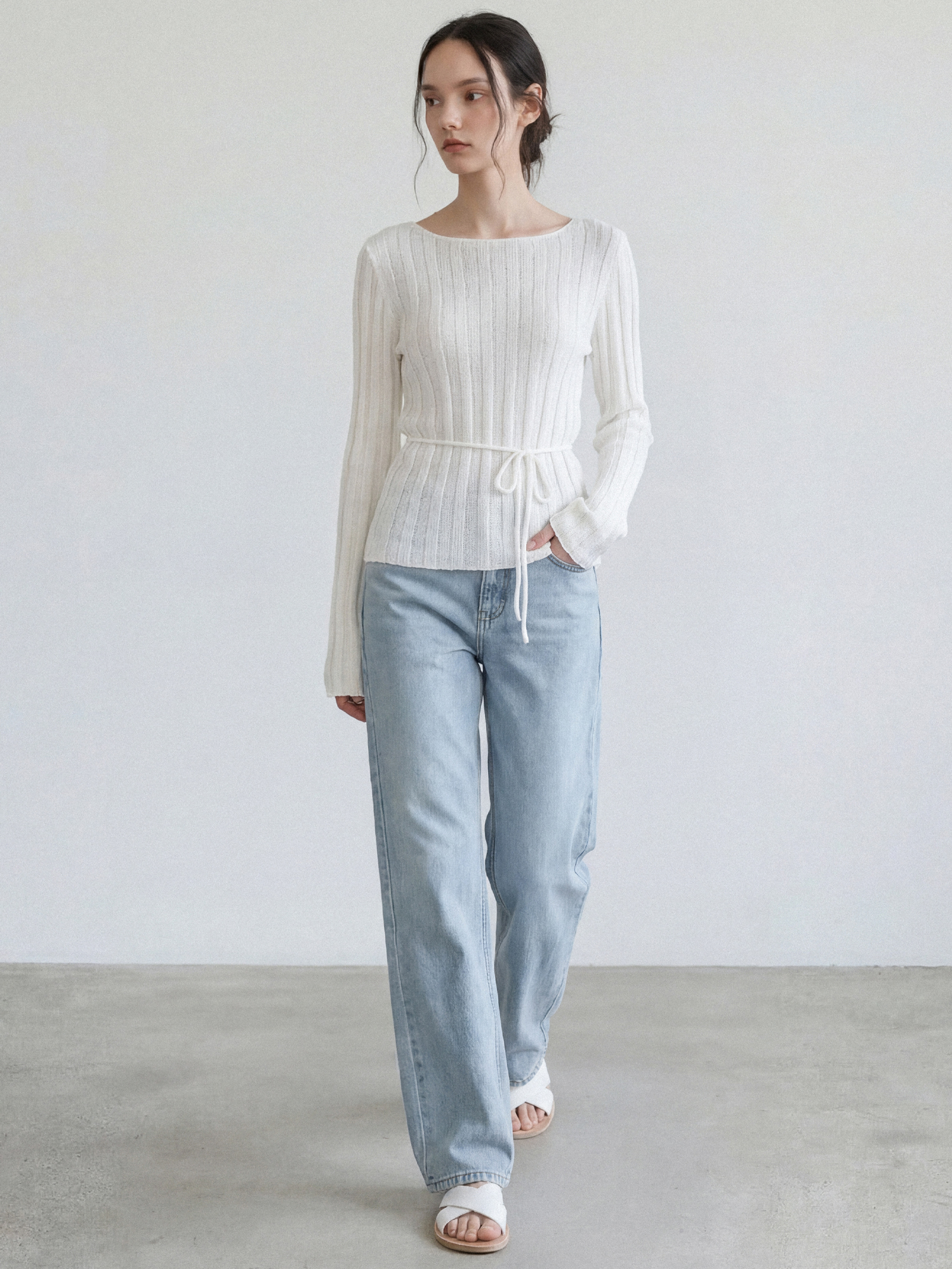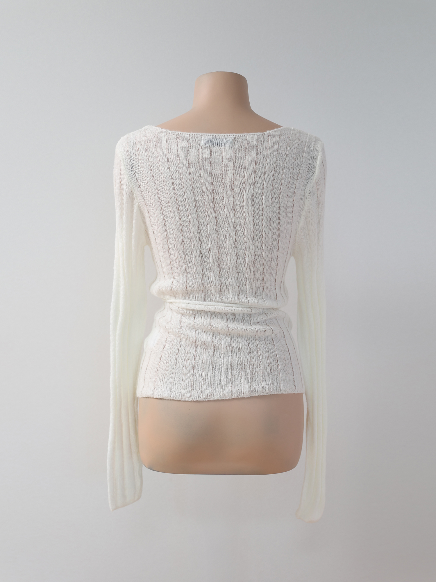 보트넥에 버티컬 립 패턴, 손등을 덮는 길이의 소매는 체형을 조금 더 슬림해 보이게 합니다.