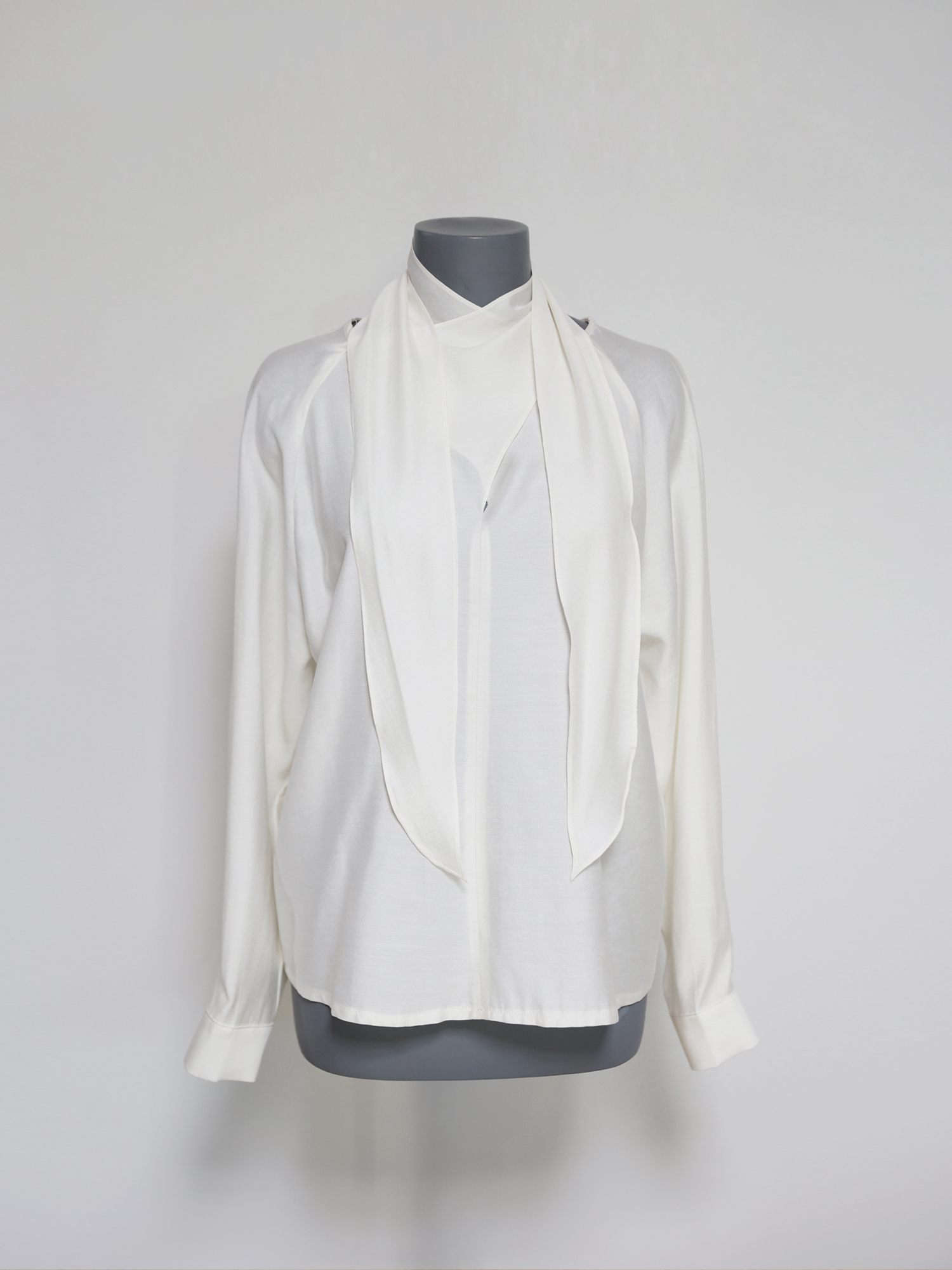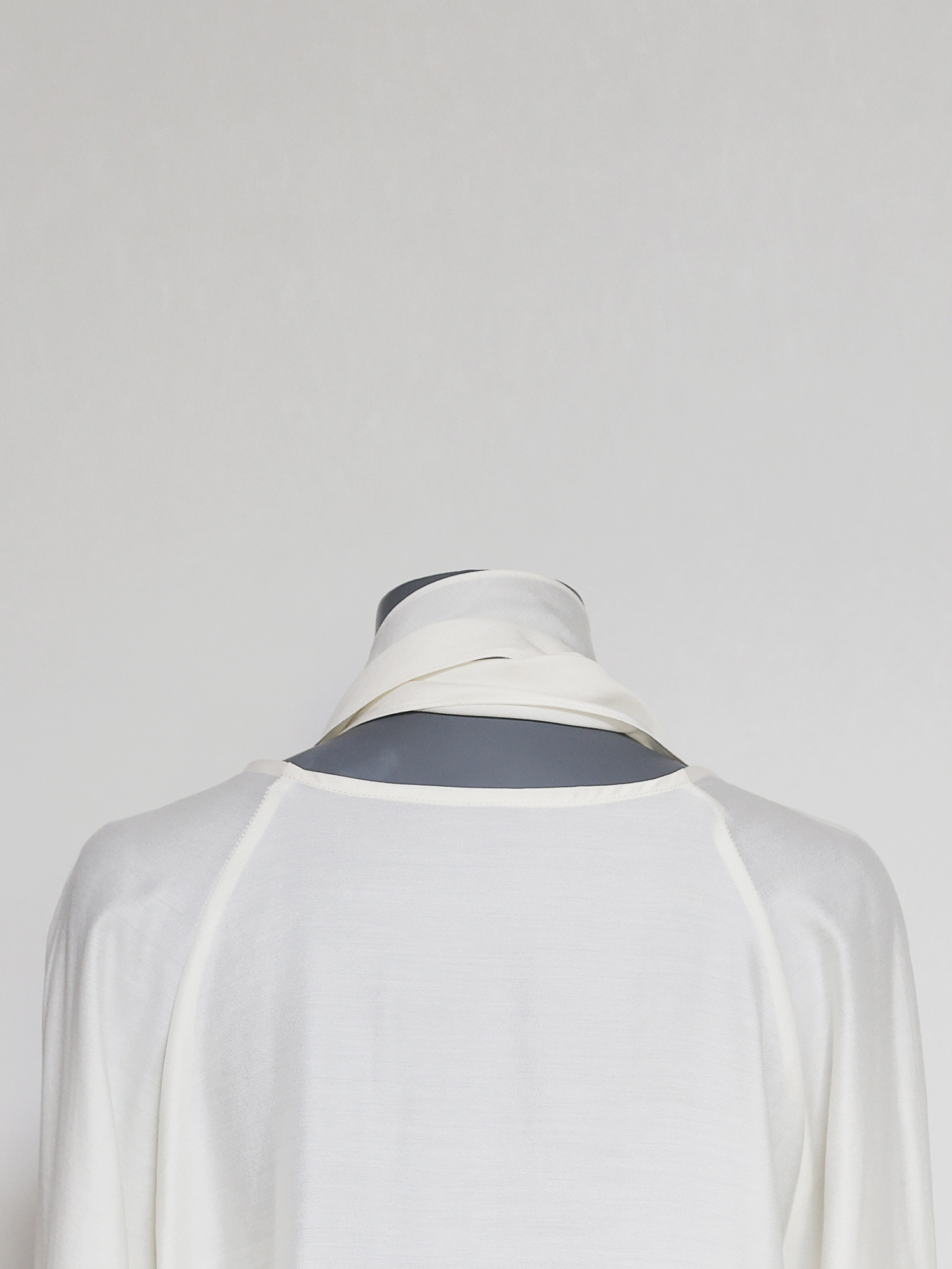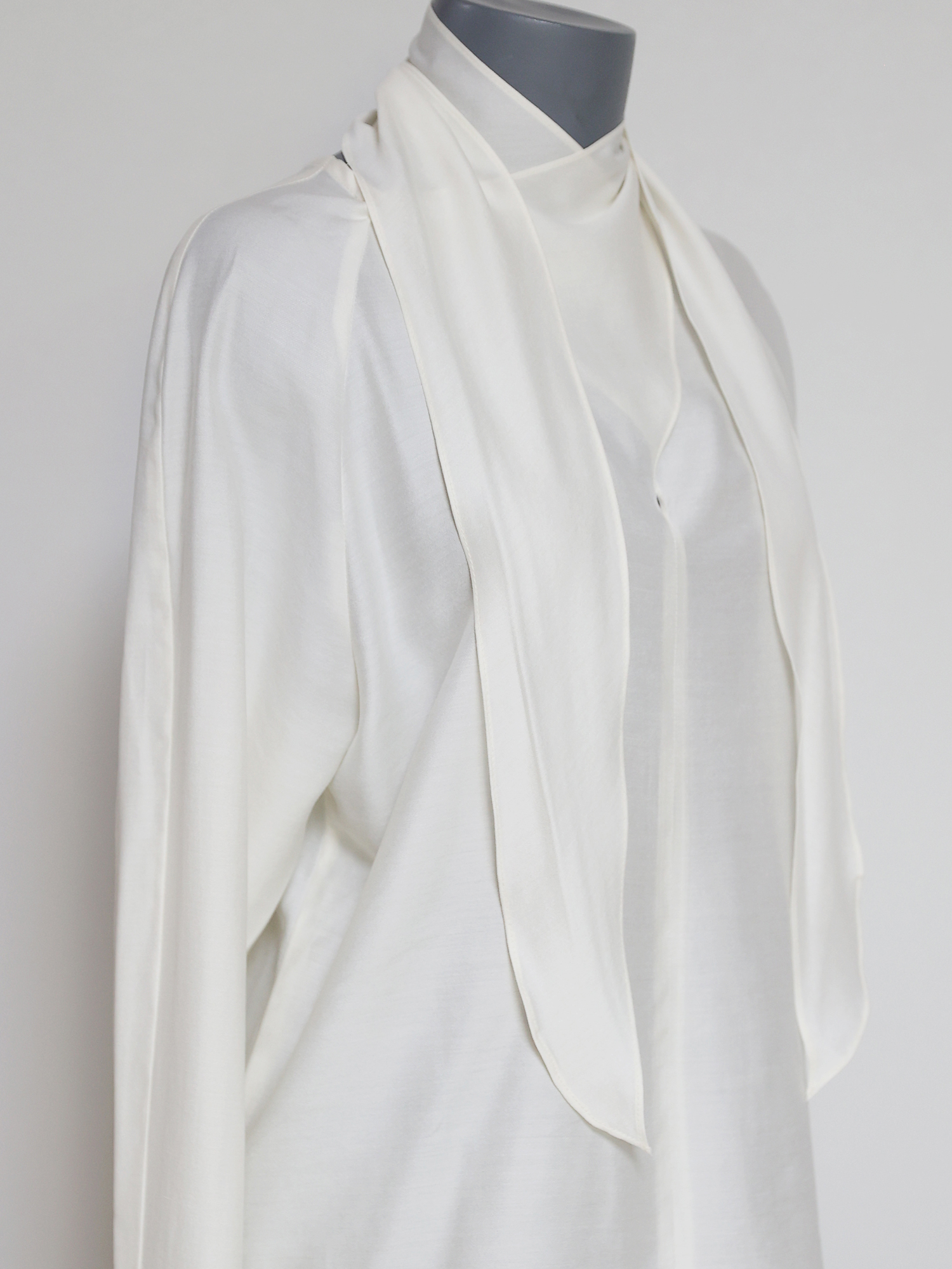 네크라인에서 이어지는 스카프를 교차하면 숄카라같이 목을 적당히 감싸주는 디자인입니다.