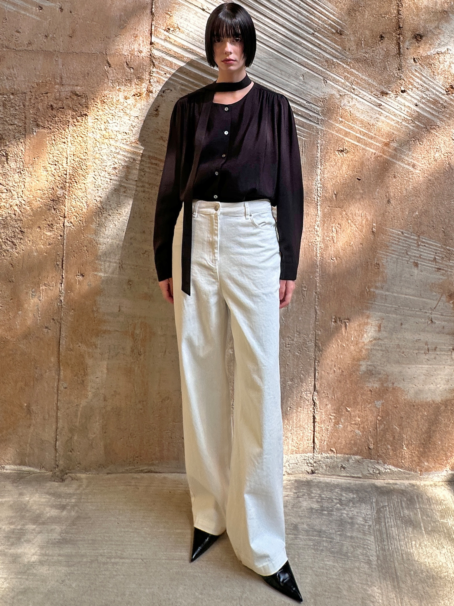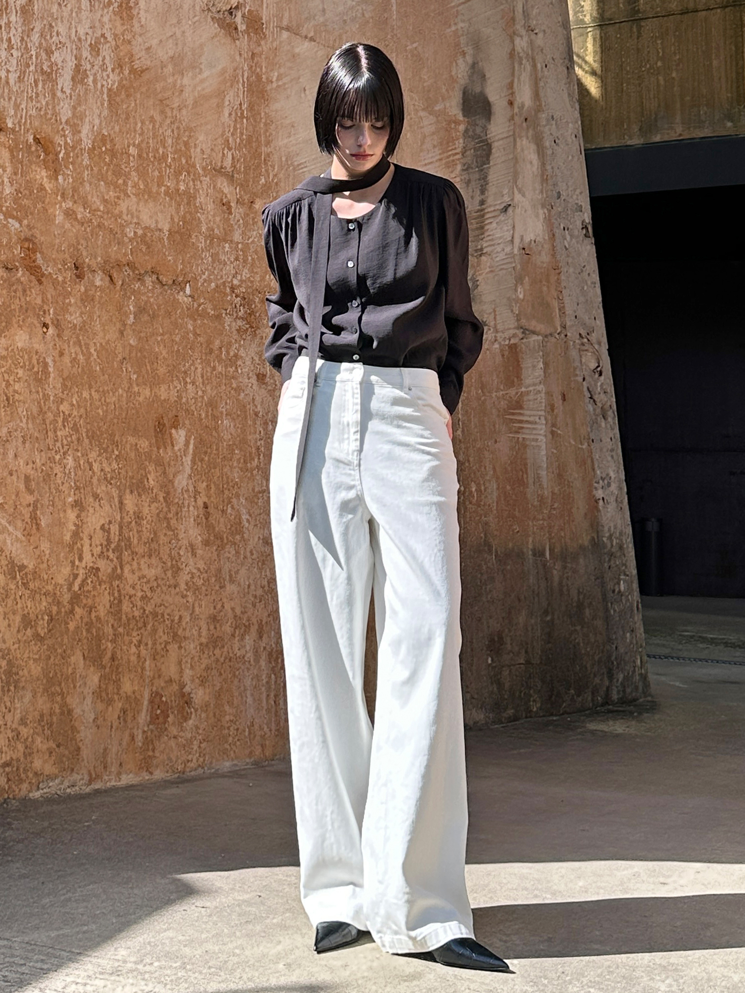 여유가 있는 라운드넥에 탈부착 가능한 스카프 디테일을 추가하여 다양하게 연출 할 수 있습니다.