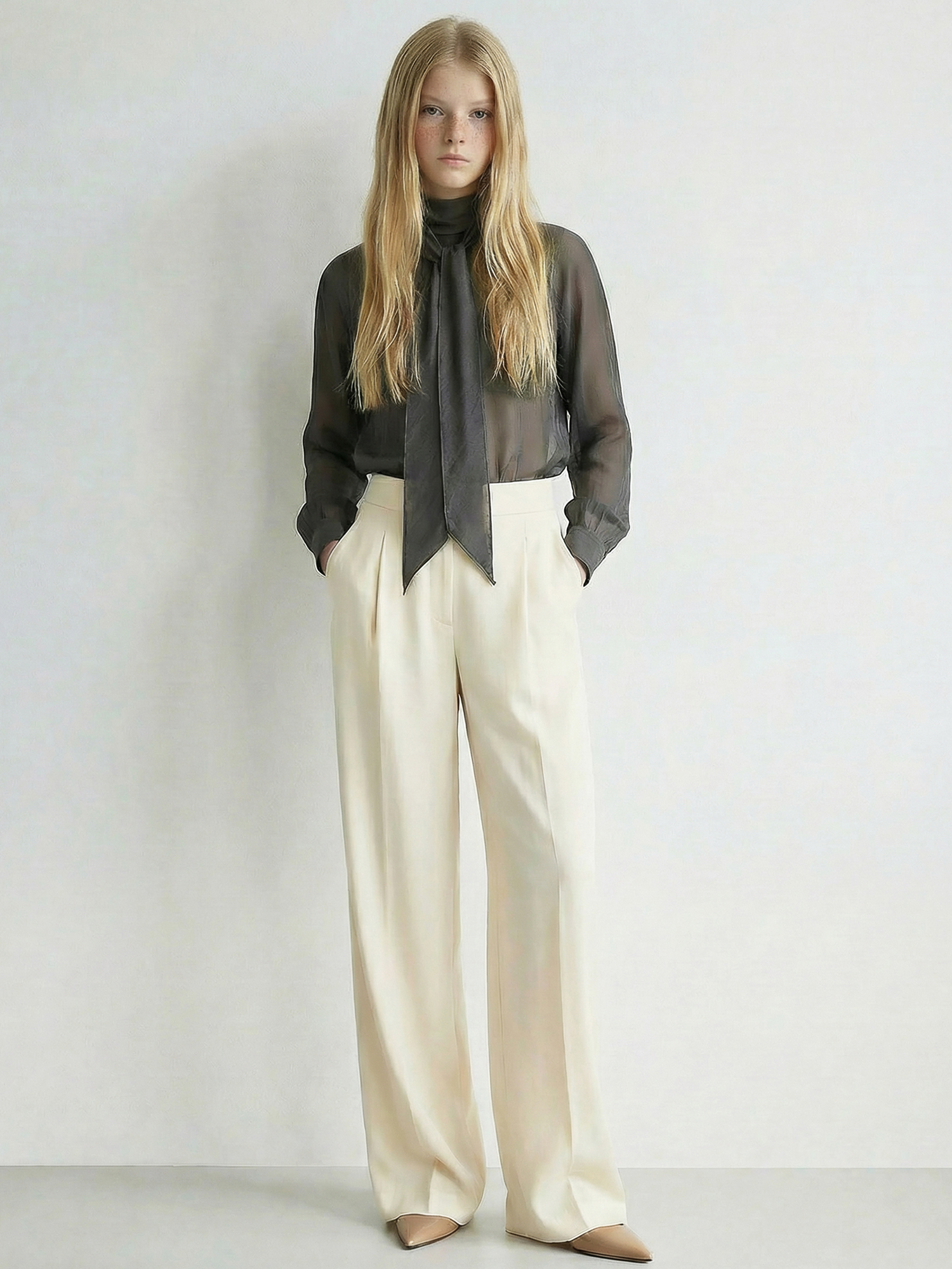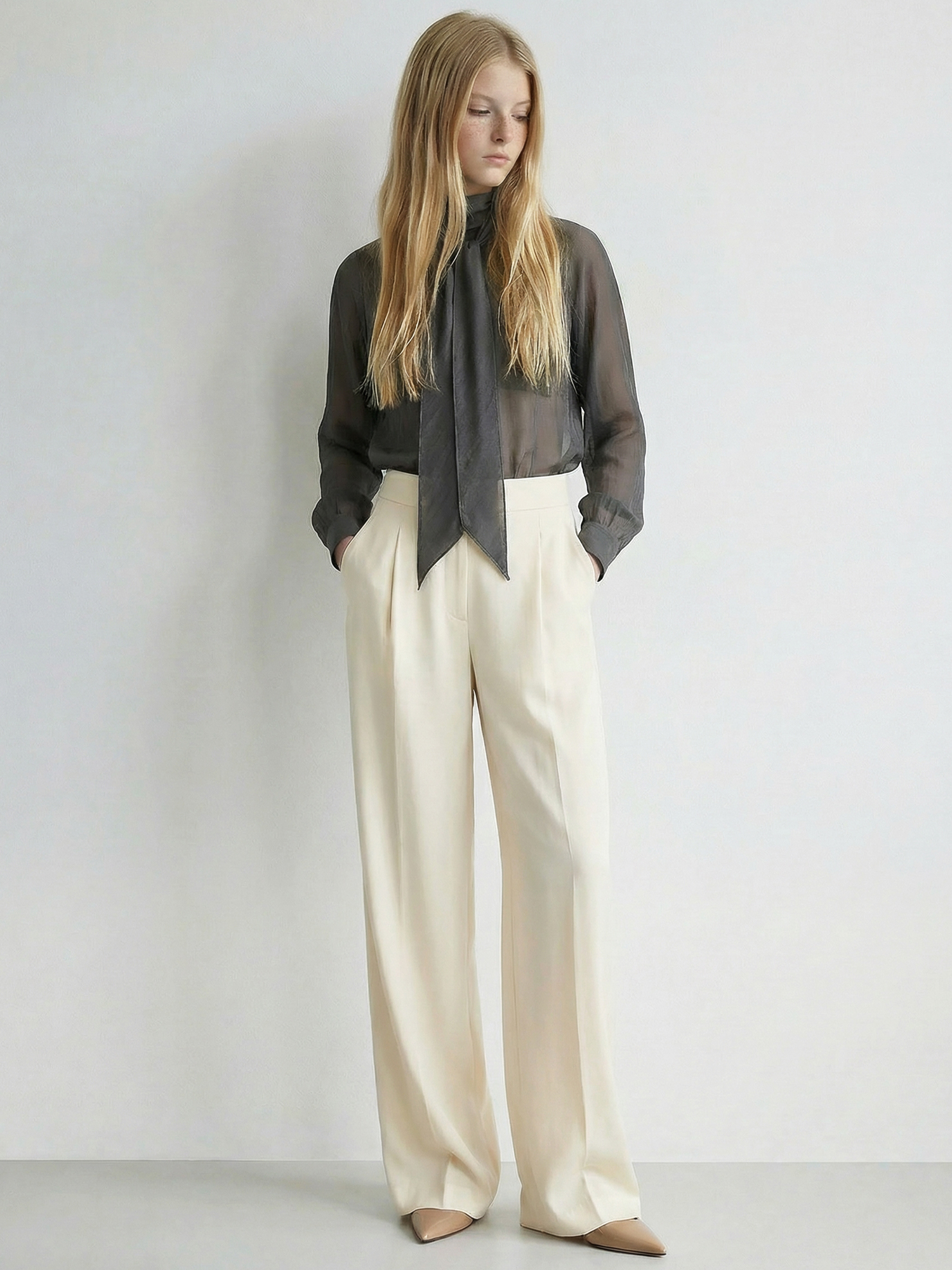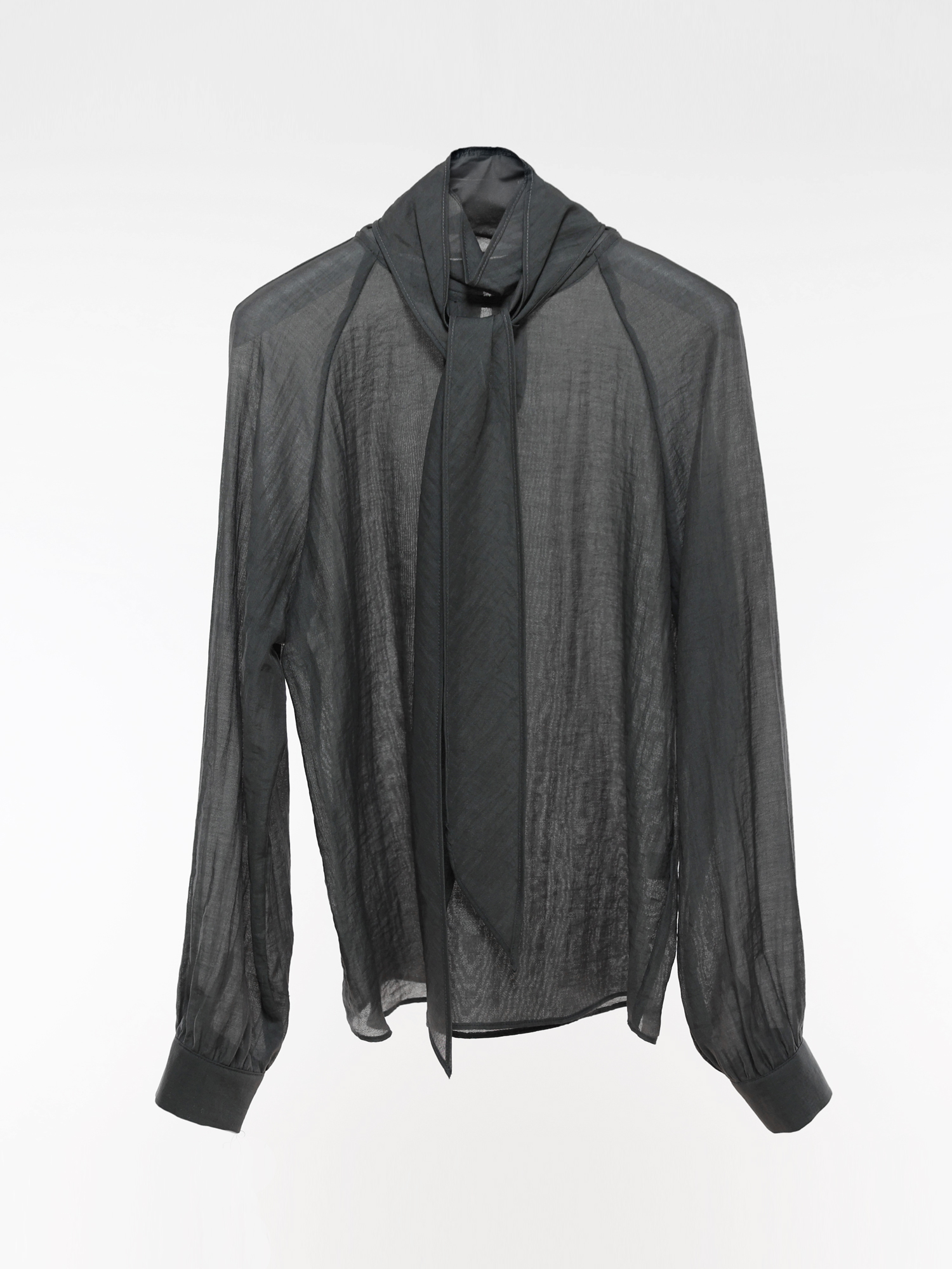 적당히 힘이 있는 소재로 네크라인과 스카프의 실루엣이 잘 유지됩니다.