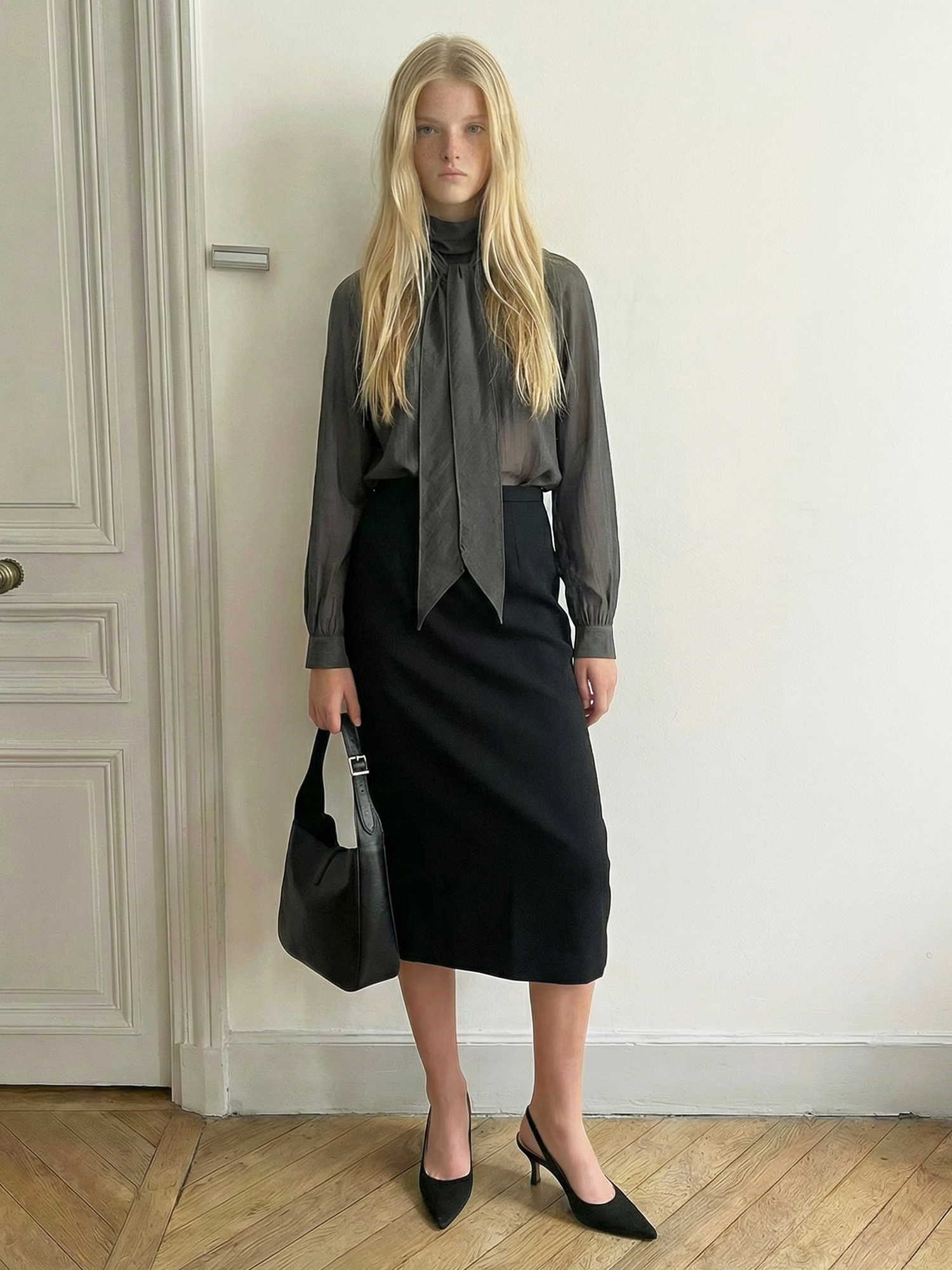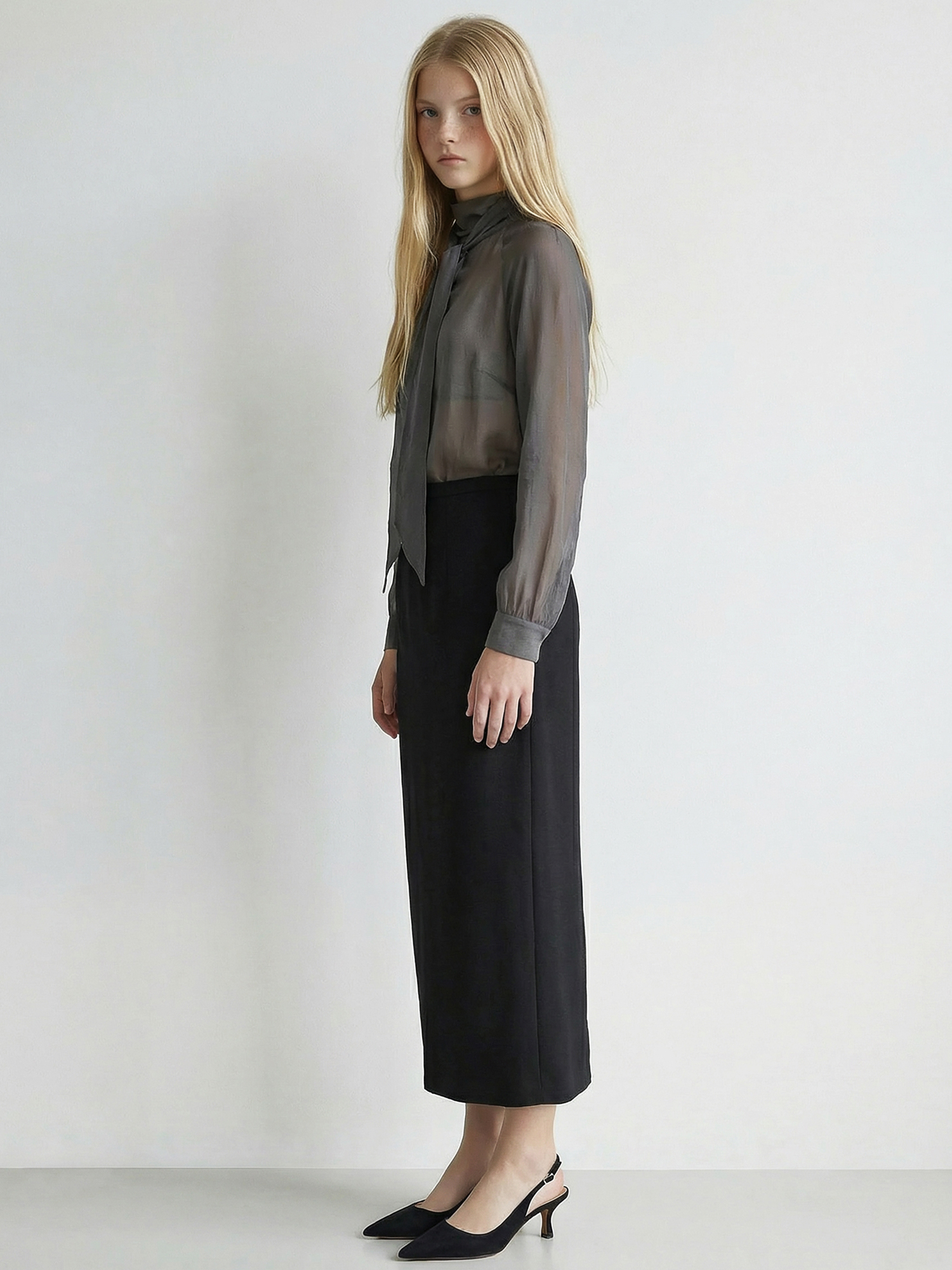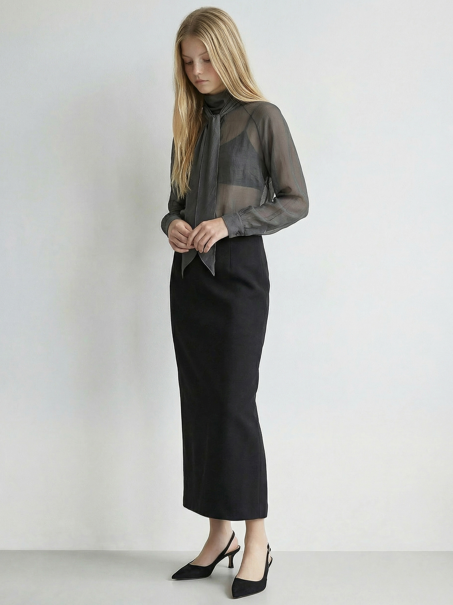 적당히 힘이 있는 소재로 네크라인과 스카프의 실루엣이 잘 유지됩니다.
