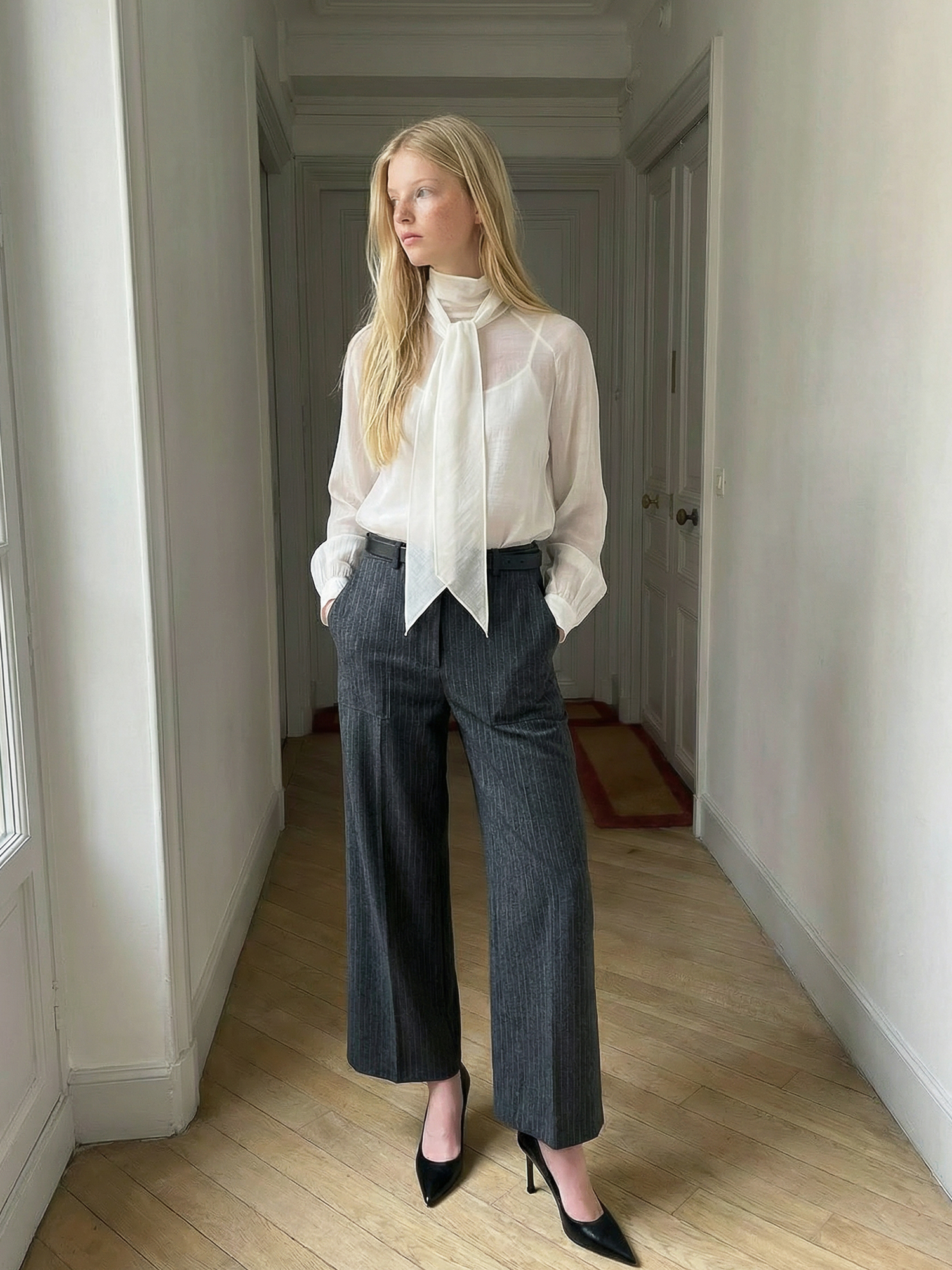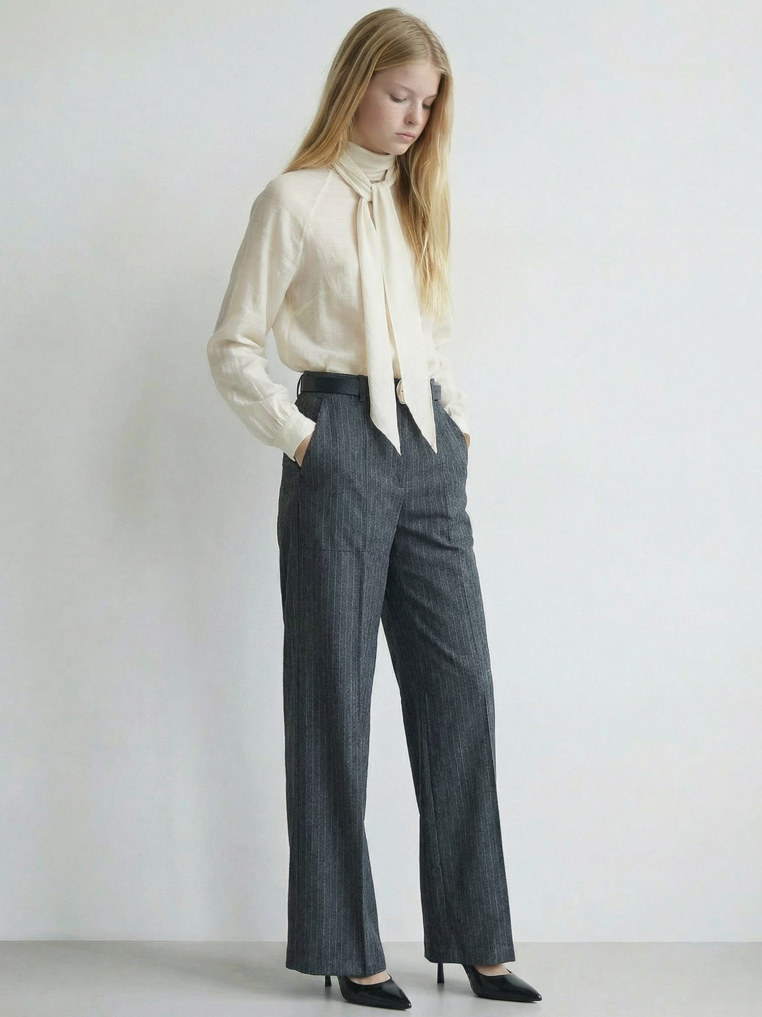적당히 힘이 있는 소재로 네크라인과 스카프의 실루엣이 잘 유지됩니다.