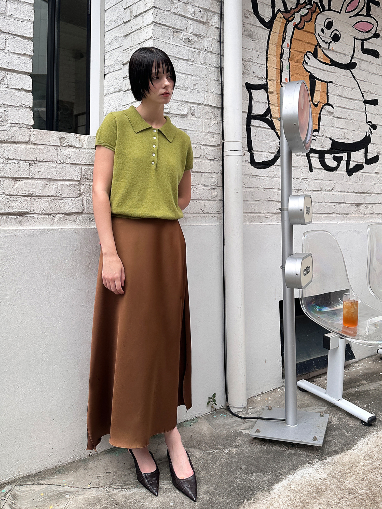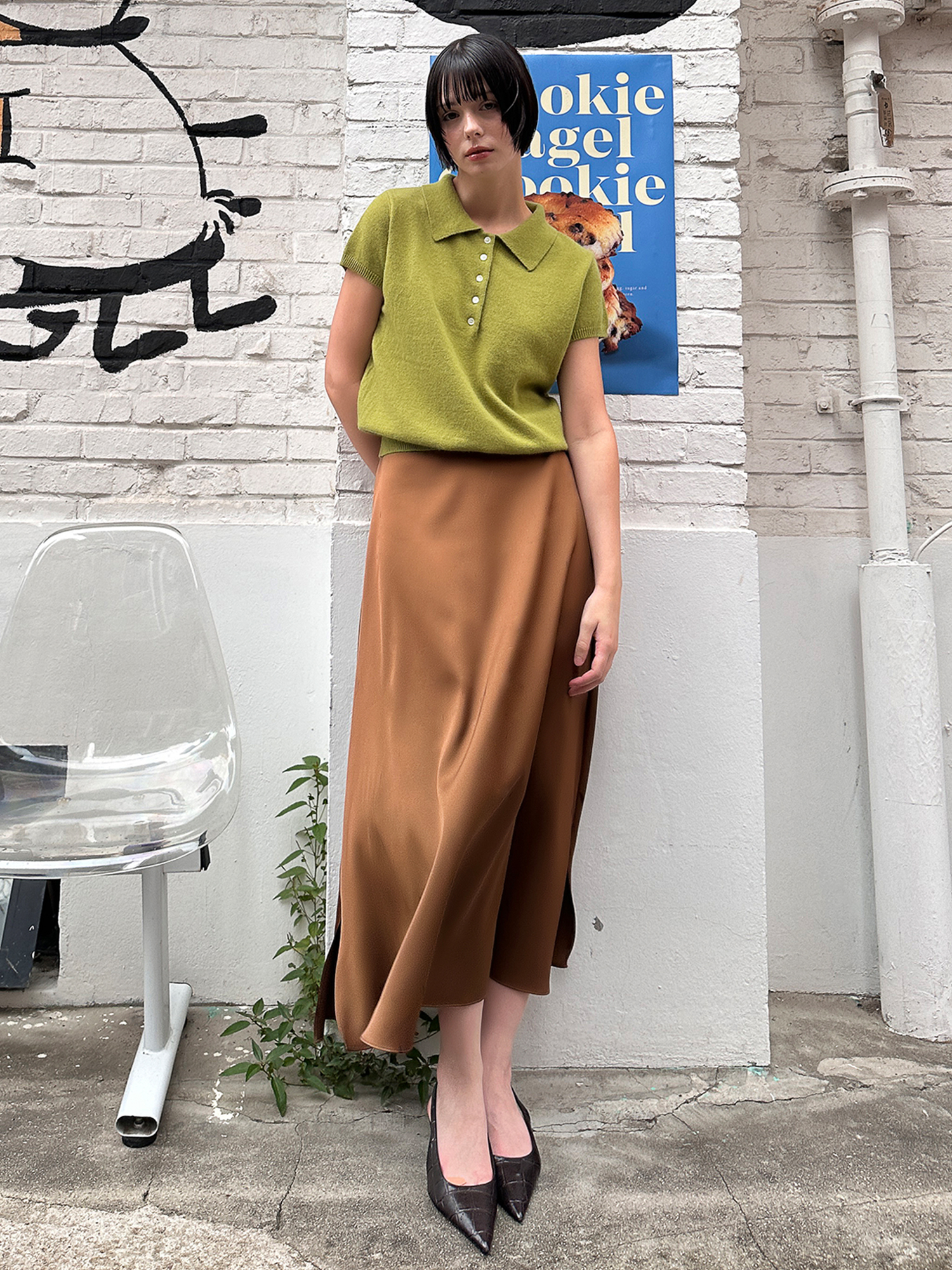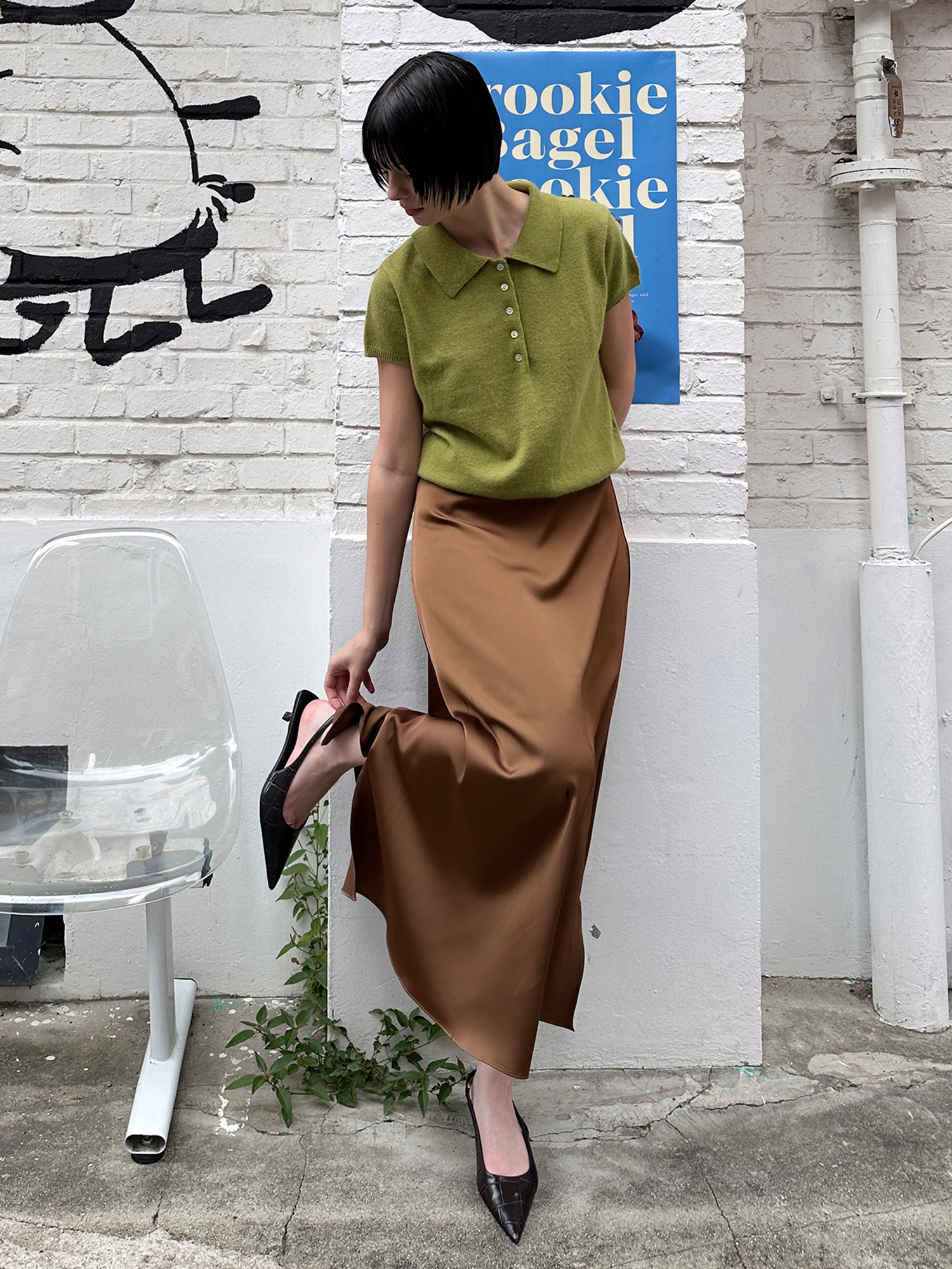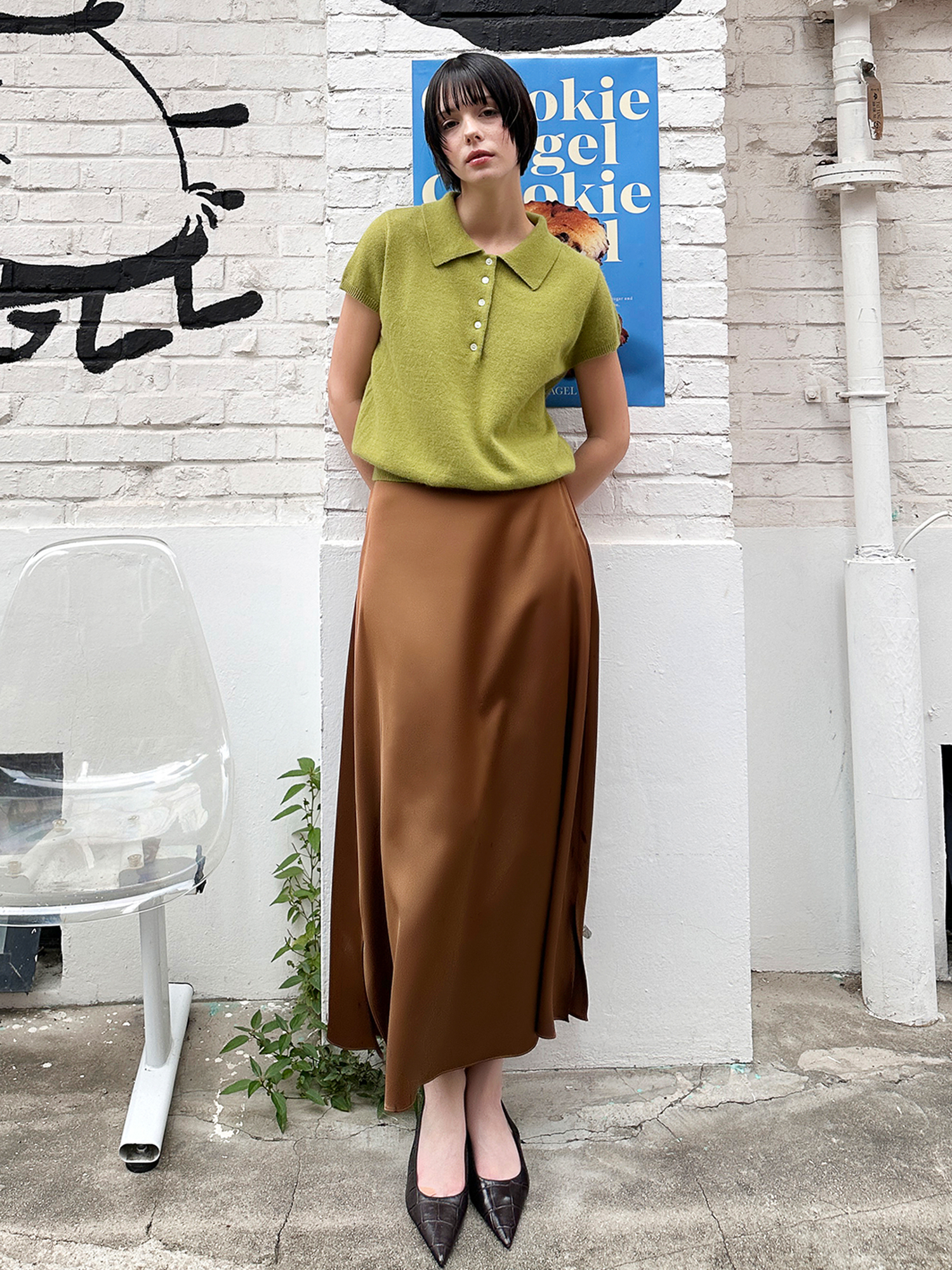 은은한 광택감의 새틴소재로 제작한 미니멀한 무드의 A라인 스커트입니다.