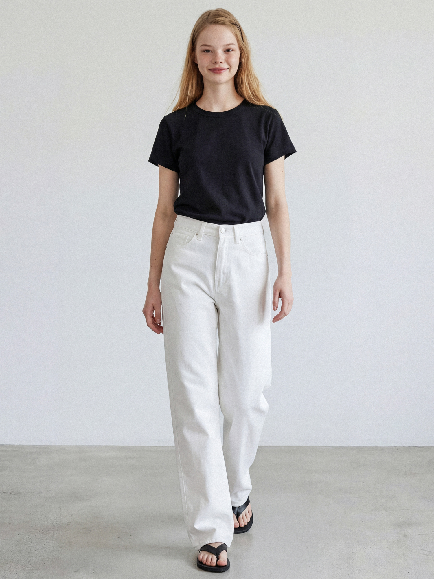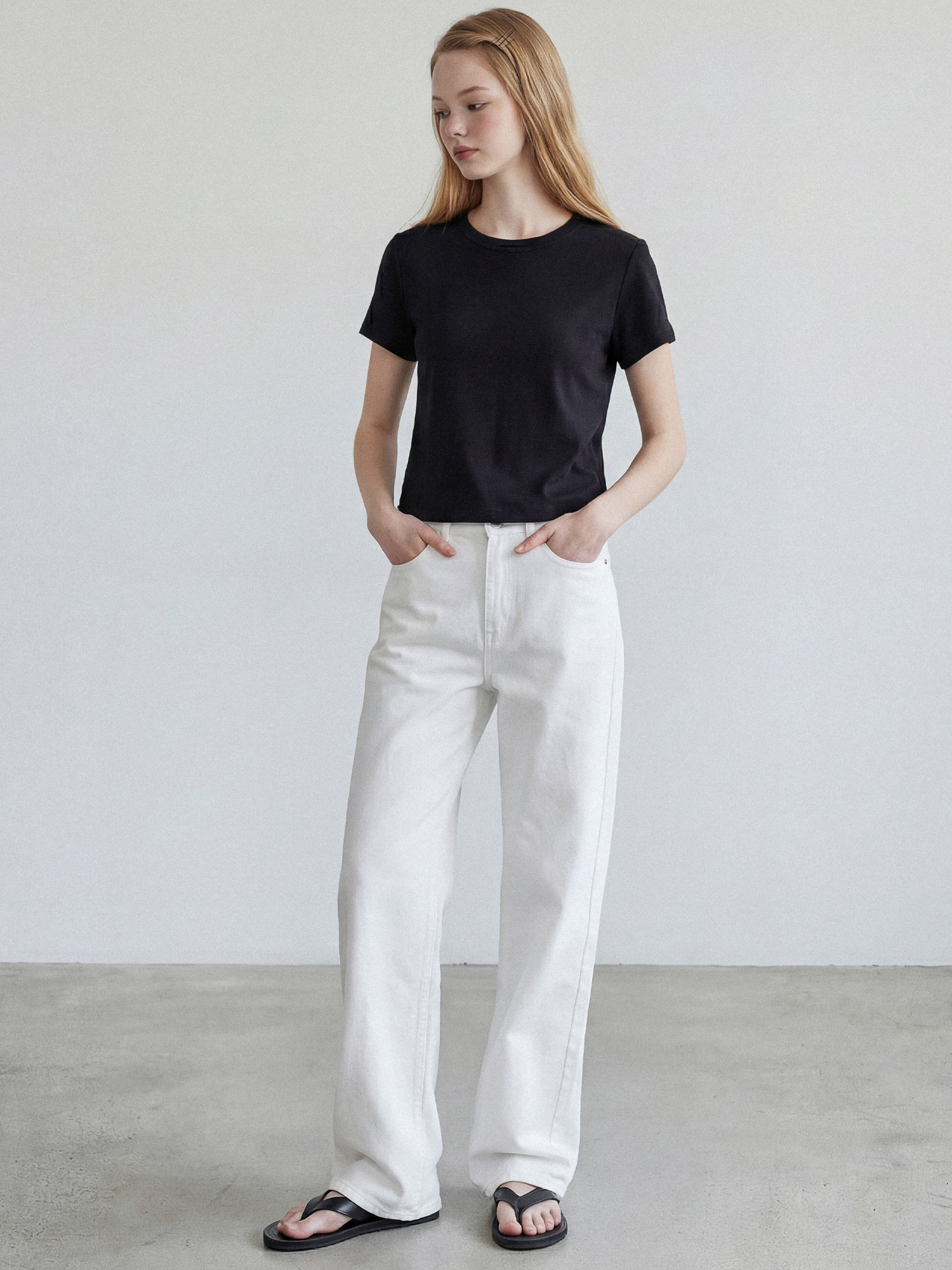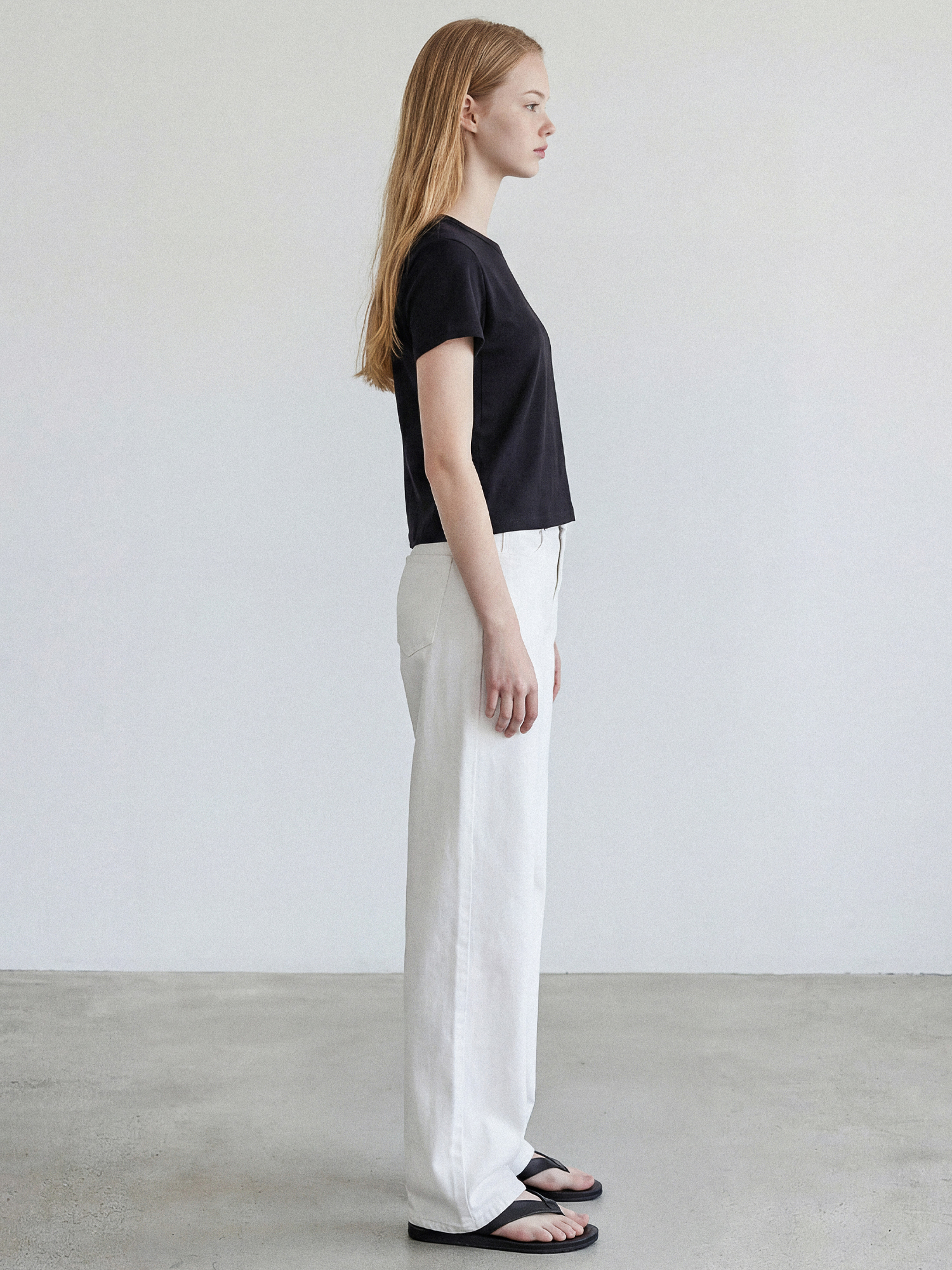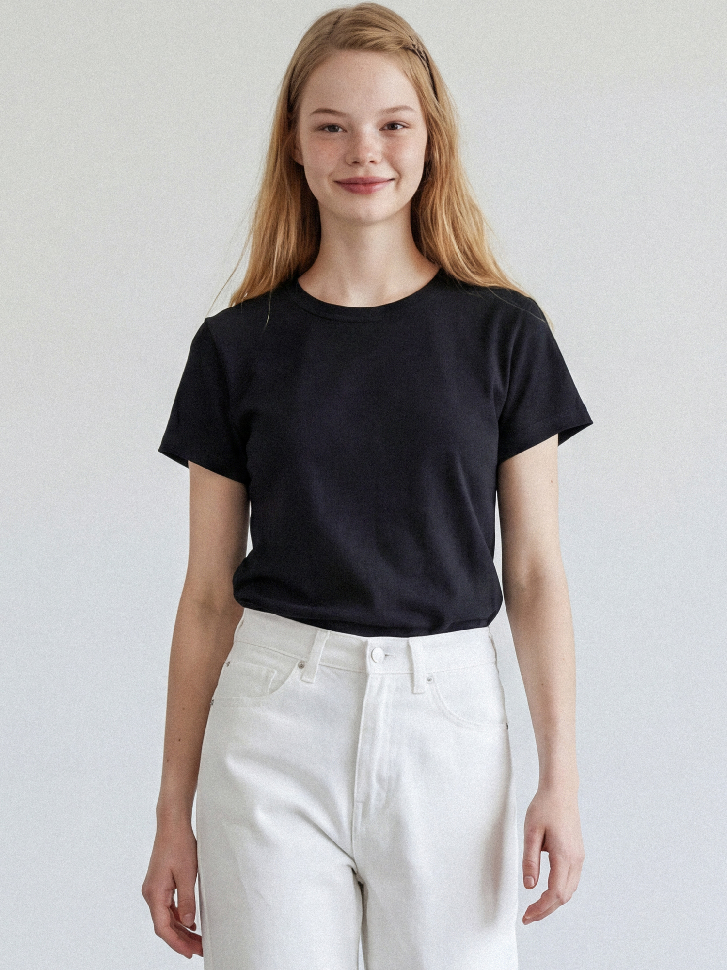 밸런스가 좋은 세미크롭 기장이며 넓은 폭의 네크라인 립은 장기간 착용에도 늘어남을 최소화 하였습니다.