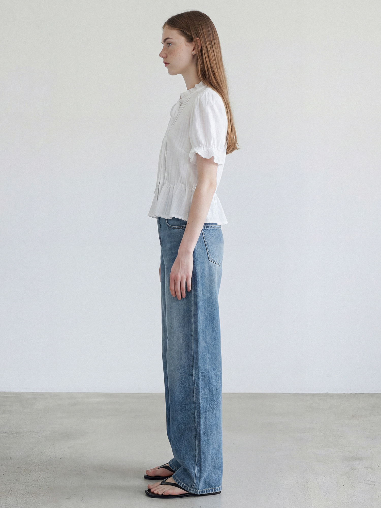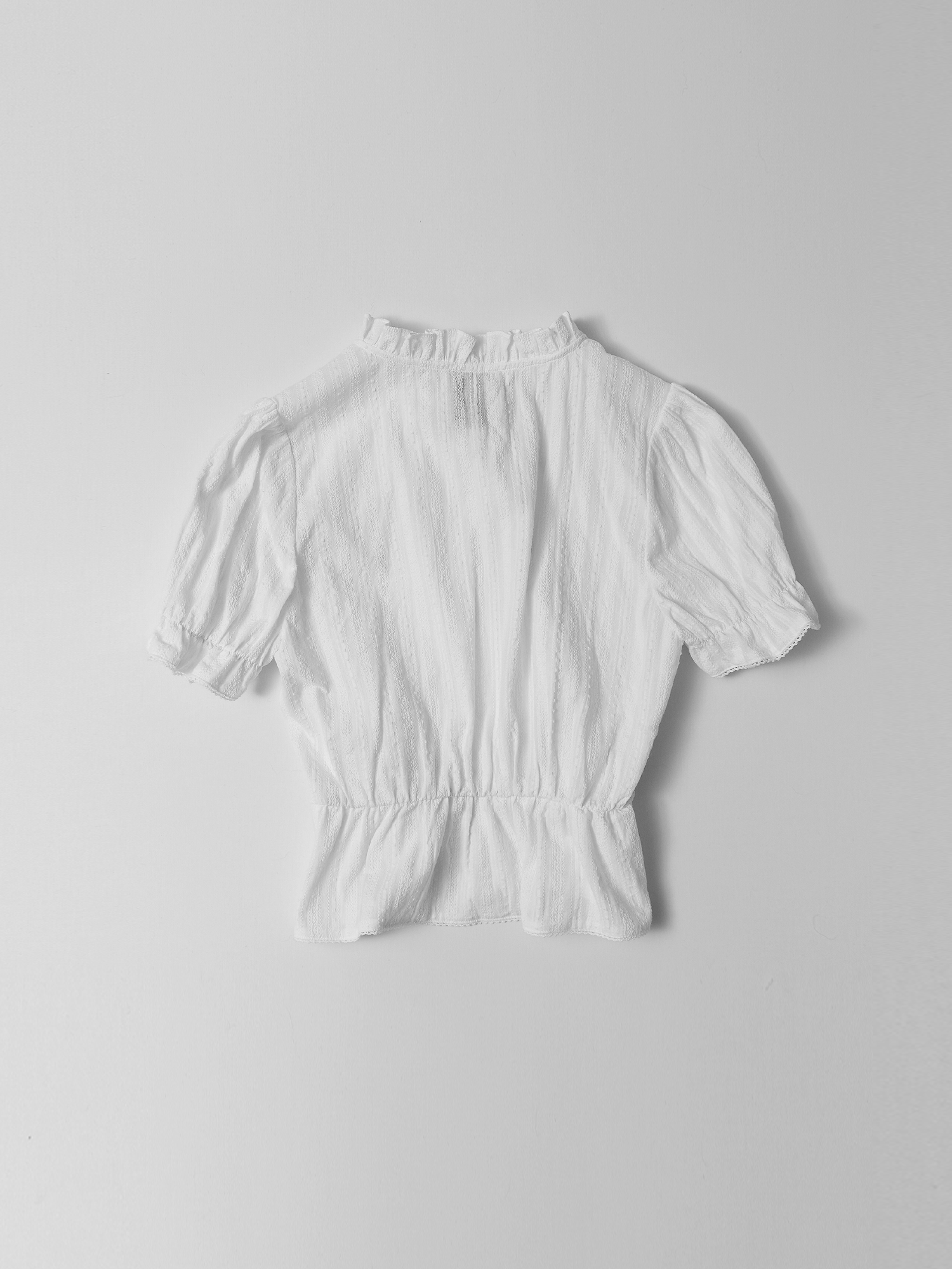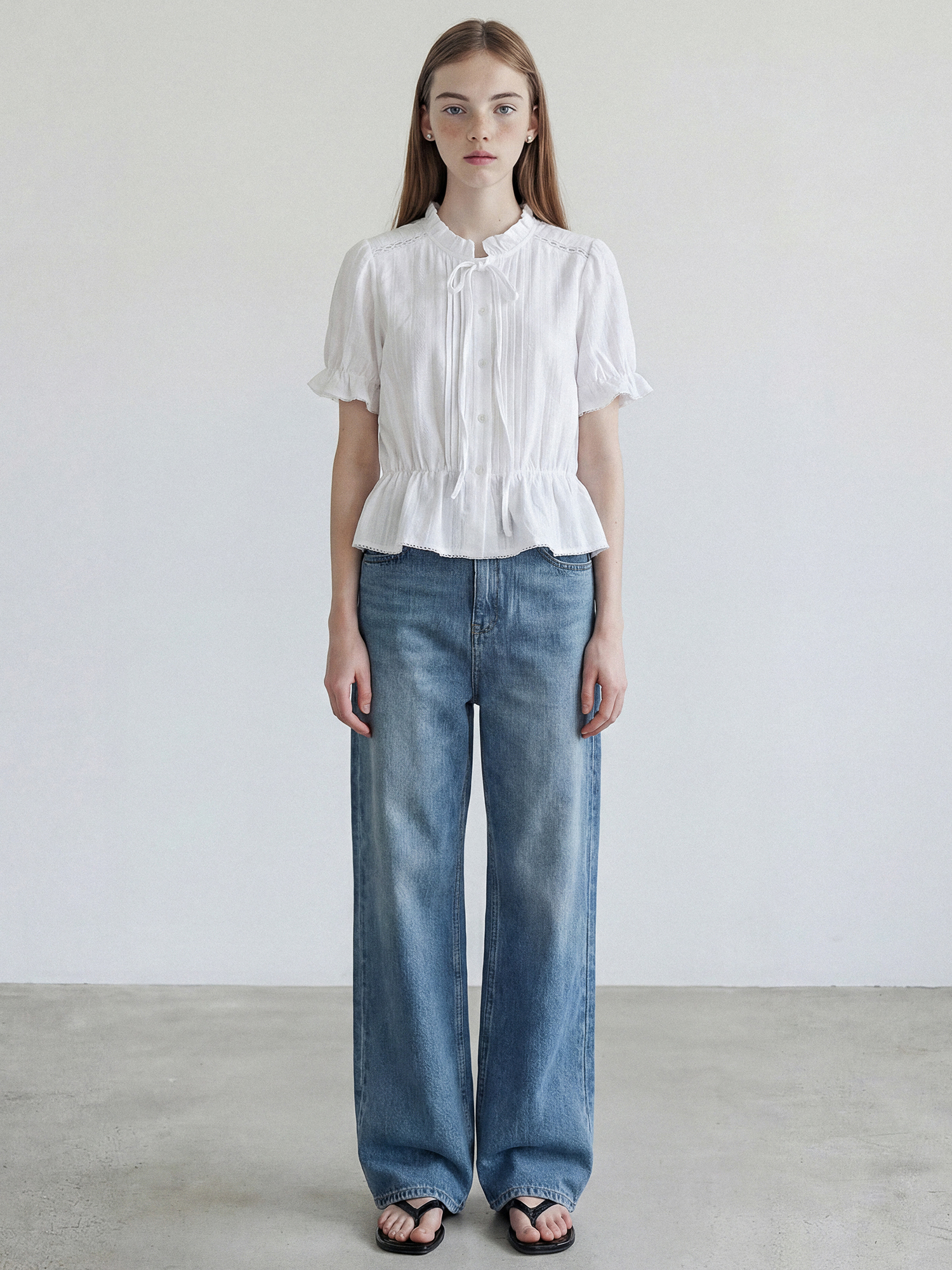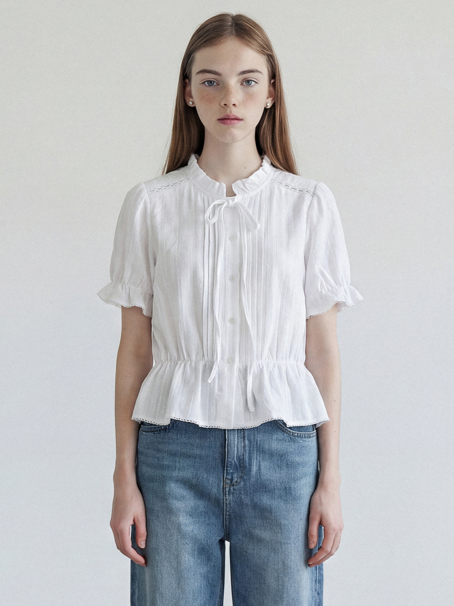 넥 라인의 잔프릴과 스트링 디테일, 어깨와 소매에 잡힌 셔링,