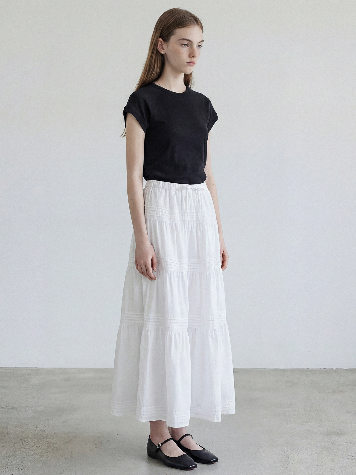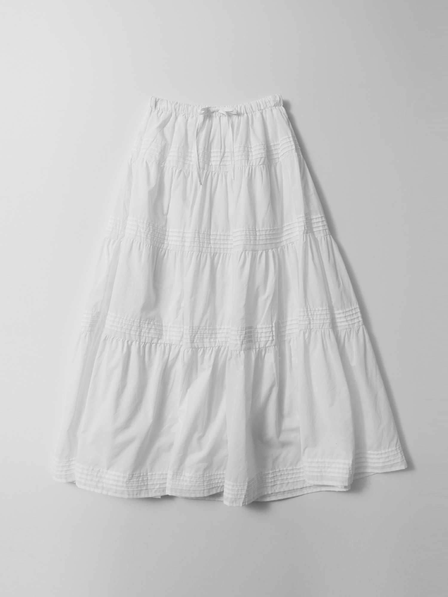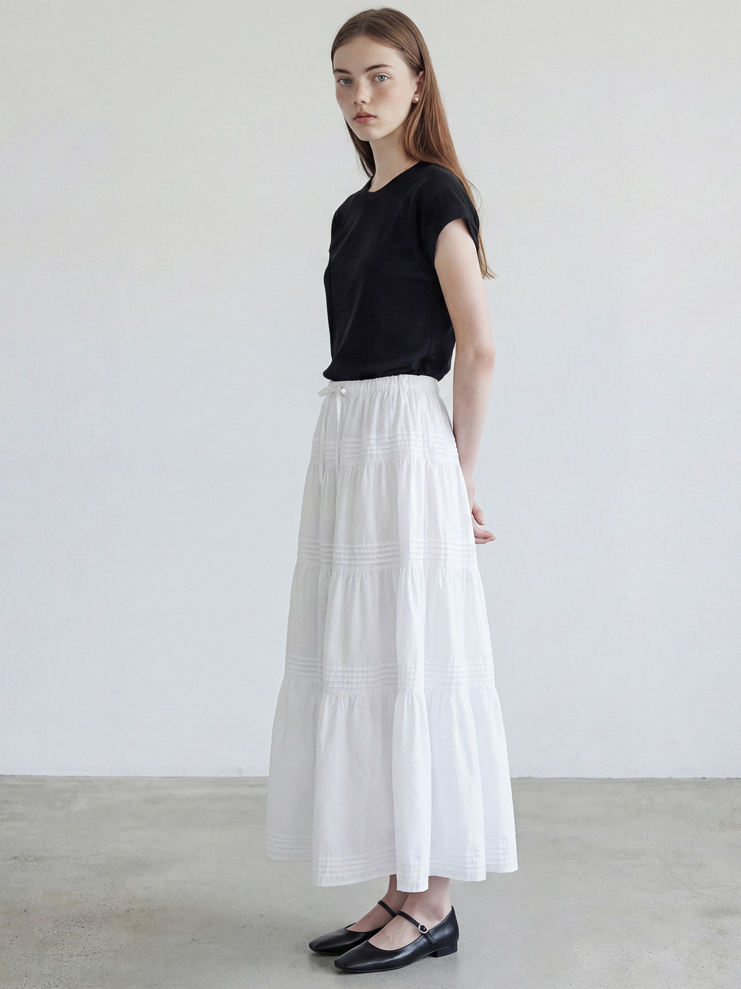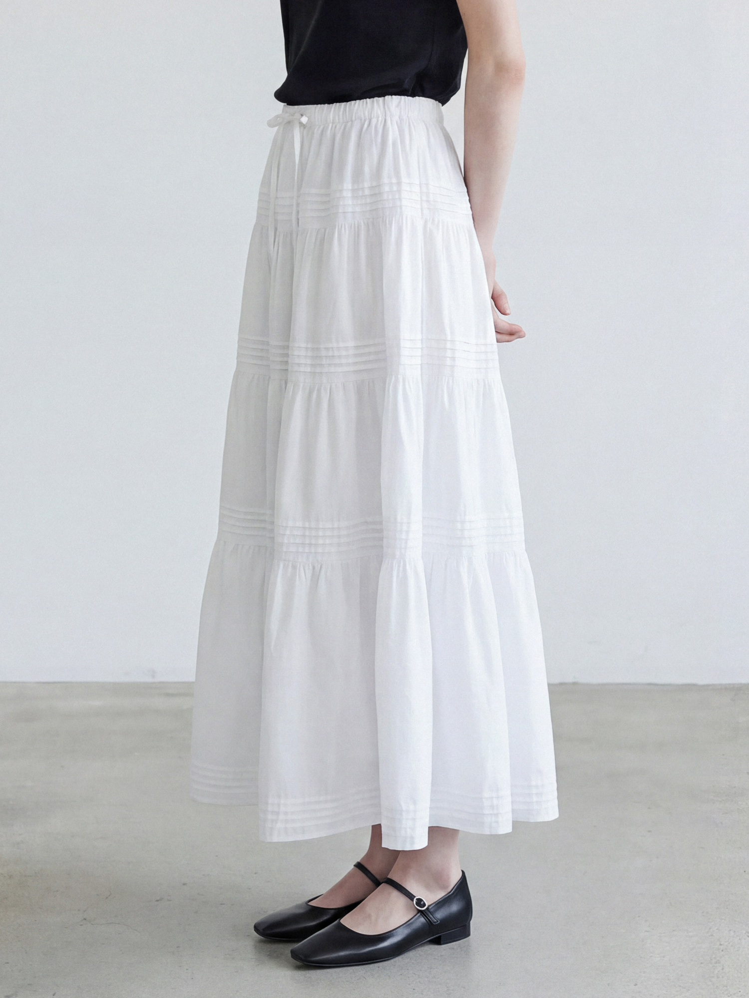 촘촘하게 잡힌 핀턱 디테일과 자연스럽게 이어지는 티어드 라인이 어우러져 풍성하면서도 단정한 실루엣을 완성해주는 스커트입니다.
