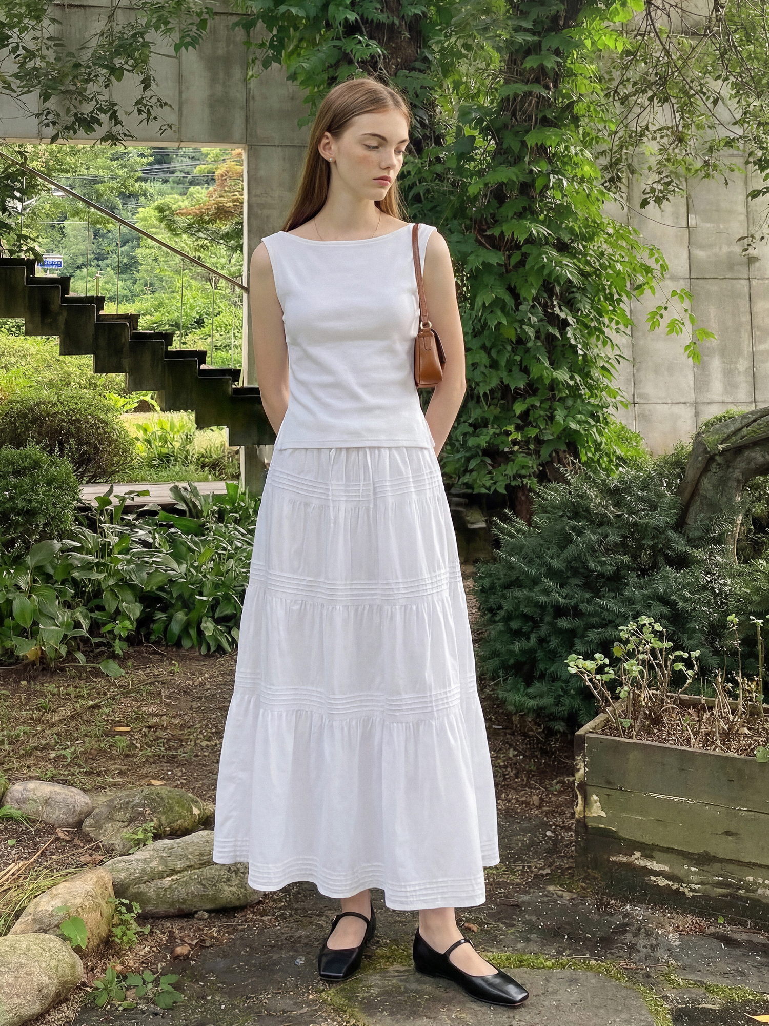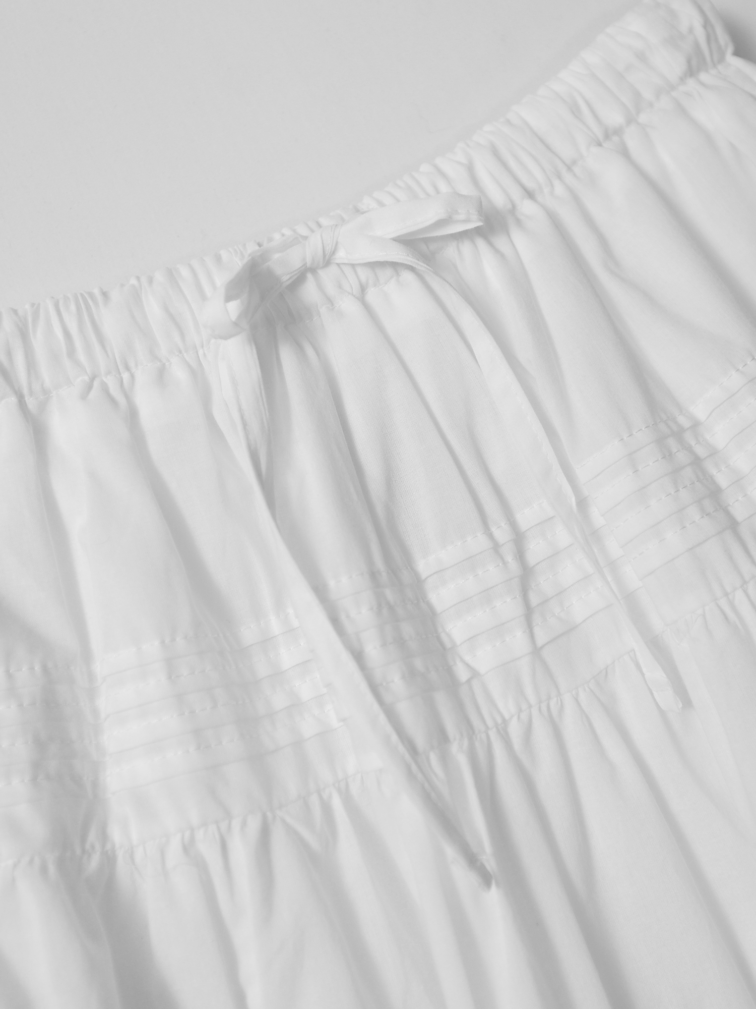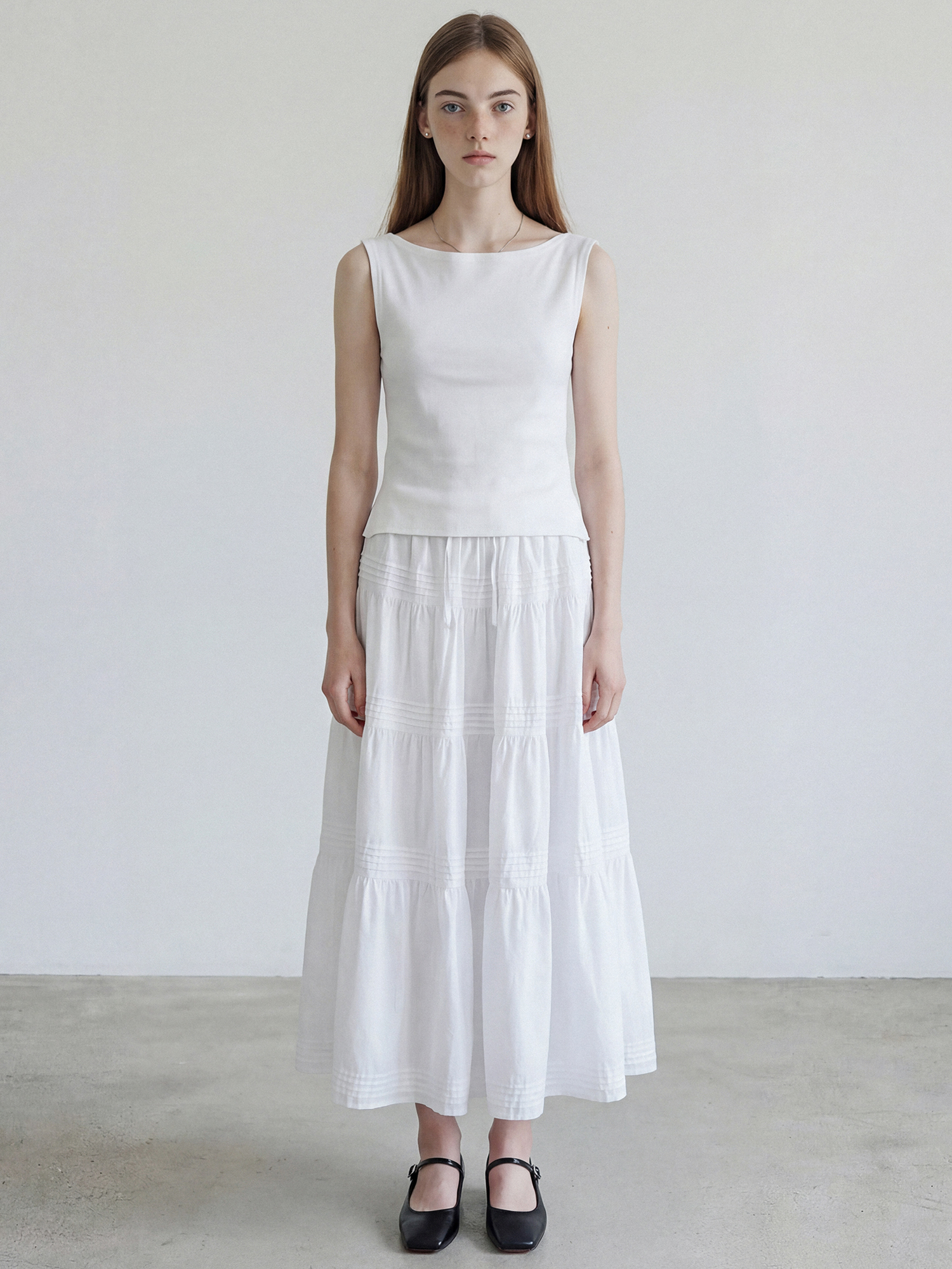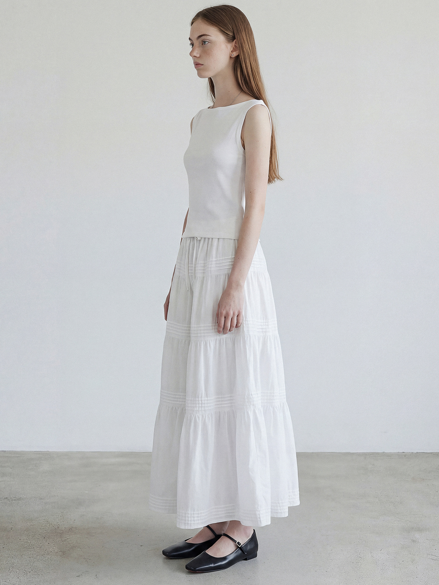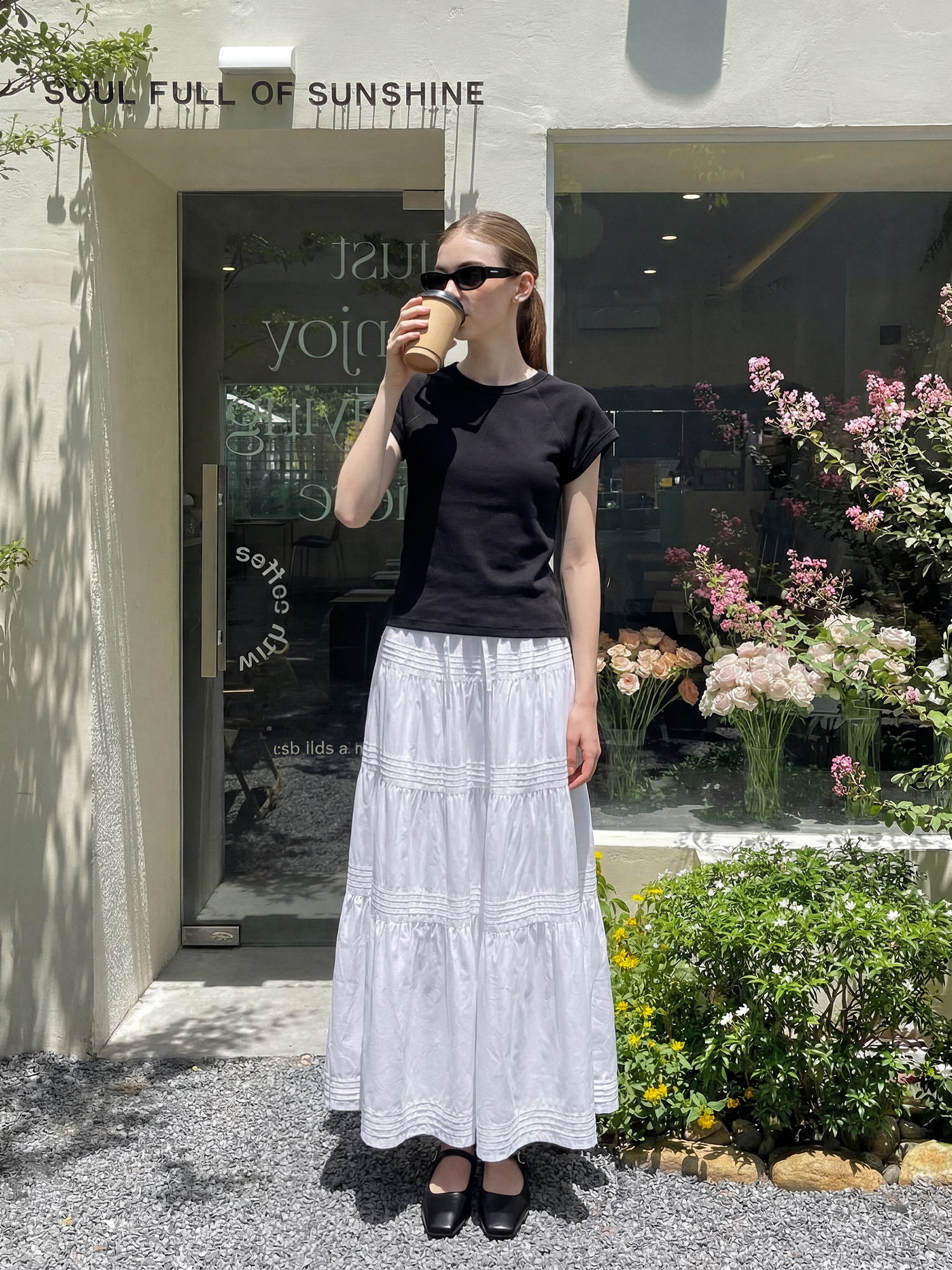 촘촘하게 잡힌 핀턱 디테일과 자연스럽게 이어지는 티어드 라인이 어우러져 풍성하면서도 단정한 실루엣을 완성해주는 스커트입니다.