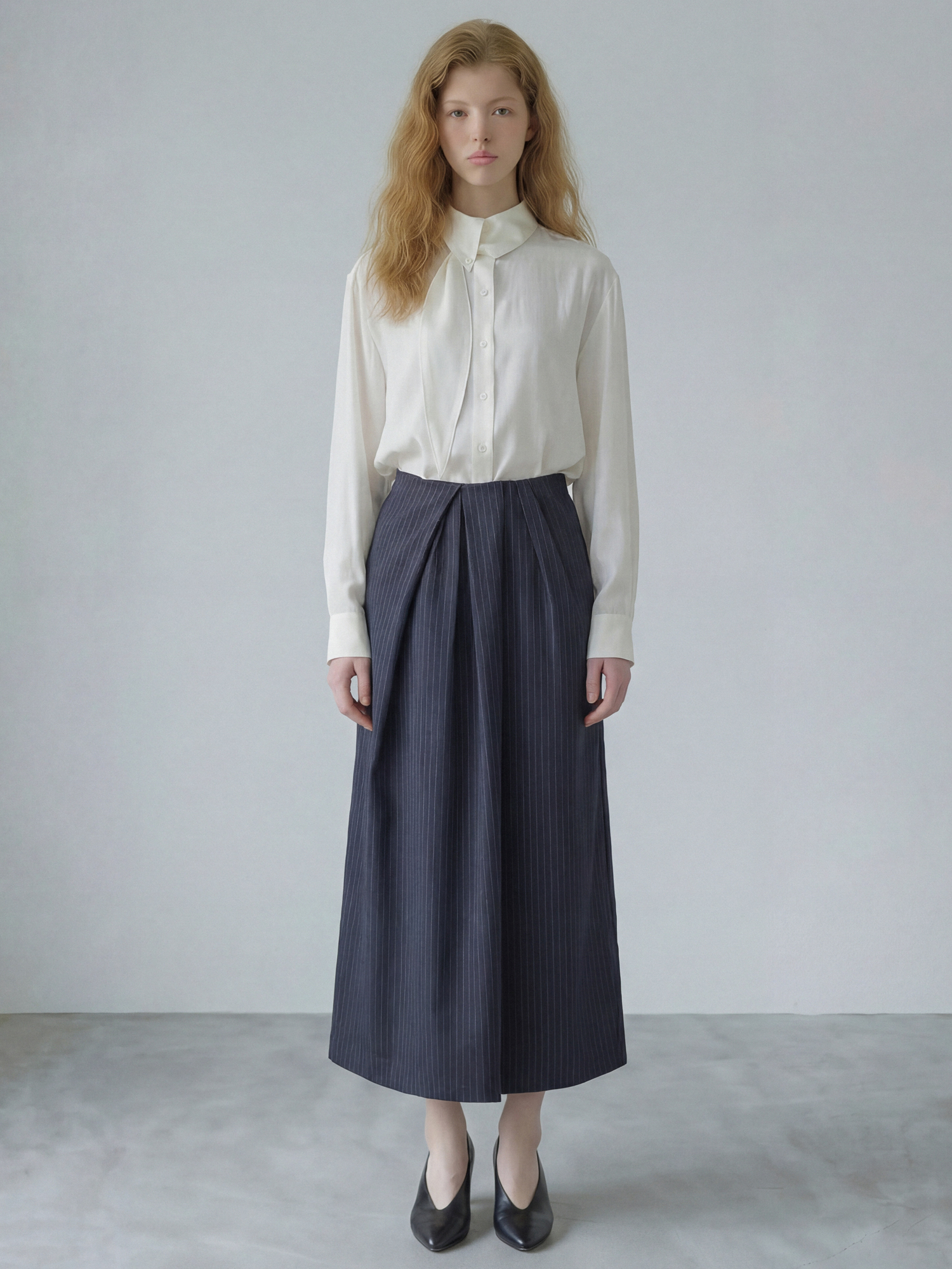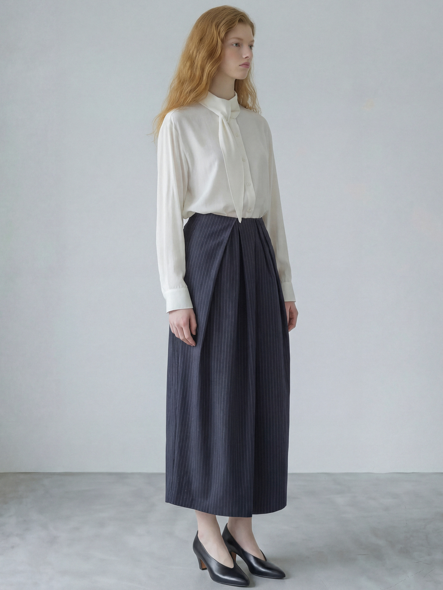 허리에서 퍼지는 드레이프성 주름이 구조적이고 드레시한 무드이며